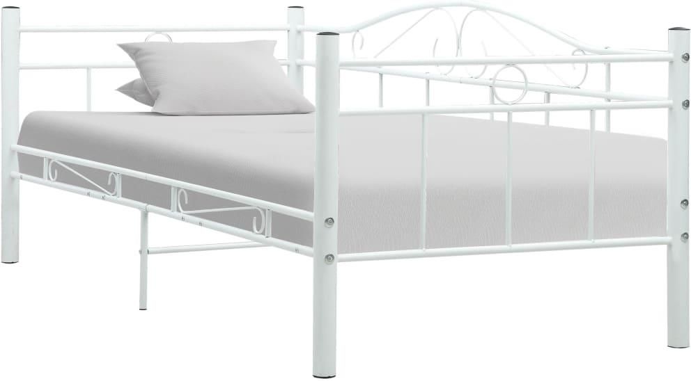 To wielofunkcyjne metalowe łóżko dzienne może być używane jako sofa w ciągu dnia lub jako łóżko w nocy, oferując miejsce do spania dla Twoich gości. Ta praktyczna rozkładana sofa przyciąga wzrok, gdziekolwiek się pojawi! Metalowa rama i środkowe belki wspornikowe przyczyniają się do jej solidnej i stabilnej konstrukcji. Rama leżanki ma pełne gracji linie ze szczegółowymi odlewami i metalowymi barierkami. Jest również łatwe w montażu. Prosimy mieć na uwadze: w skład dostawy wchodzi tylko rama leżanki. Materac nie jest wliczony w cenę. Możesz sprawdzić w naszym sklepie pasujące materace. Kolor: biały Materiał: metal Wymiary całkowite: 206 x 97 x 74,5 cm (dł. x szer. x wys.) Wysokość powierzchni spania nad ziemią: 28 cm Może służyć zarówno jako łóżko gościnne, jak i sofa Wymiary pasującego materaca: 90 x 200 cm (szer. x dł.); materac nie jest częścią przesyłki Wymagany montaż: tak