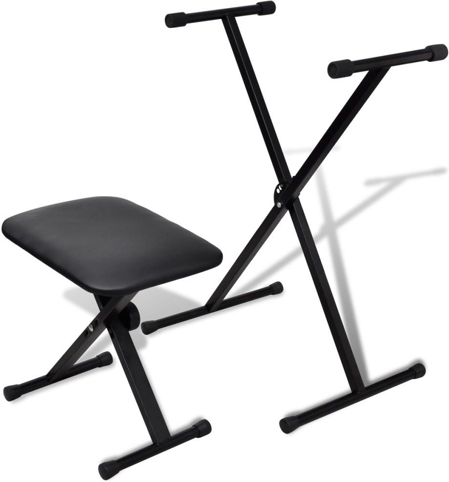 Statyw pod keyboard, regulowany z taboretem vidaXL Kolor: Array Statyw pod keyboard w kształcie litery X, wraz z taboretem został wykonany z solidnej stali. Będzie idealnym sprzętem dla zespołów, artystów oraz każdej osoby kochającej muzykę. Dzięki solidnemu wykonaniu będzie służyć przez długie lata. Regulowana wysokość pozwoli uzyskać stabilność i wygodę. Dzięki okrągłemu mechanizmowi blokującemu cały zestaw jest bardzo prosty w użyciu. Antypoślizgowe gumowe zatyczki nie tylko zabezpieczą podłogę przed zarysowaniami, ale również zapewnią dodatkową stabilność. Statyw jest składany, co ułatwia jego transport i przechowywanie. W skład przesyłki wchodzi jeden statyw i jeden taboret. Kolor: czarny Materiał: stal Statyw Wymiary po złożeniu: 101 x 46 x 7 cm (dł. x szer. x wys.) Regulowana wysokość: 63 - 97,5 cm 5 różnych wysokości pracy Maksymalne obciążenie: 60 kg Taboret Wymiary po złożeniu: 62 x 33 x 11 cm (dł. x szer. x wys.) Wymiary siedziska: 46 x 34 x 3 cm (dł. x szer. x gr.) Regulowana wysokość: 40 - 48 cm Regulacja wysokości na 3 poziomach Materiał: Bawełna: 5%, Poliester: 10%, PCV: 85%