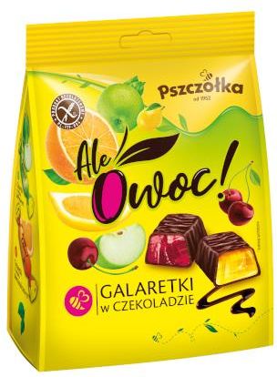ALE OWOC! Galaretka w czekoladzie - PSZCZÓŁKA Kuszą lekką galaretką ukrytą pod aksamitną czekoladą, delikatnie rozpływającą się w ustach. Wśród czterech soczyście owocowych smaków: cytrynowym, pomarańczowym, wiśniowym, jabłkowym każdy znajdzie coś dla siebie. Wartościowe składniki czekolada …