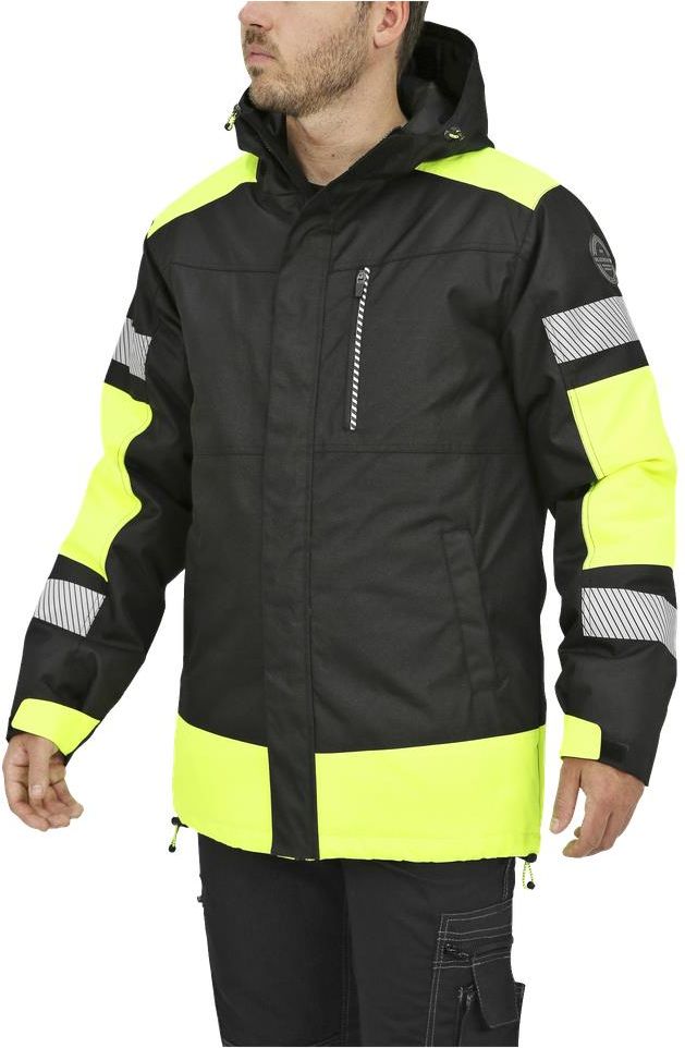 Wytrzymała kurtka robocza z elementami w kolorze żółtym, z odblaskowego materiału, u dołu ściągana sznurkiem ze stoperem, mankiety zapinane na rzep i ściągacze przy nadgarstkach z otworami na kciuk.