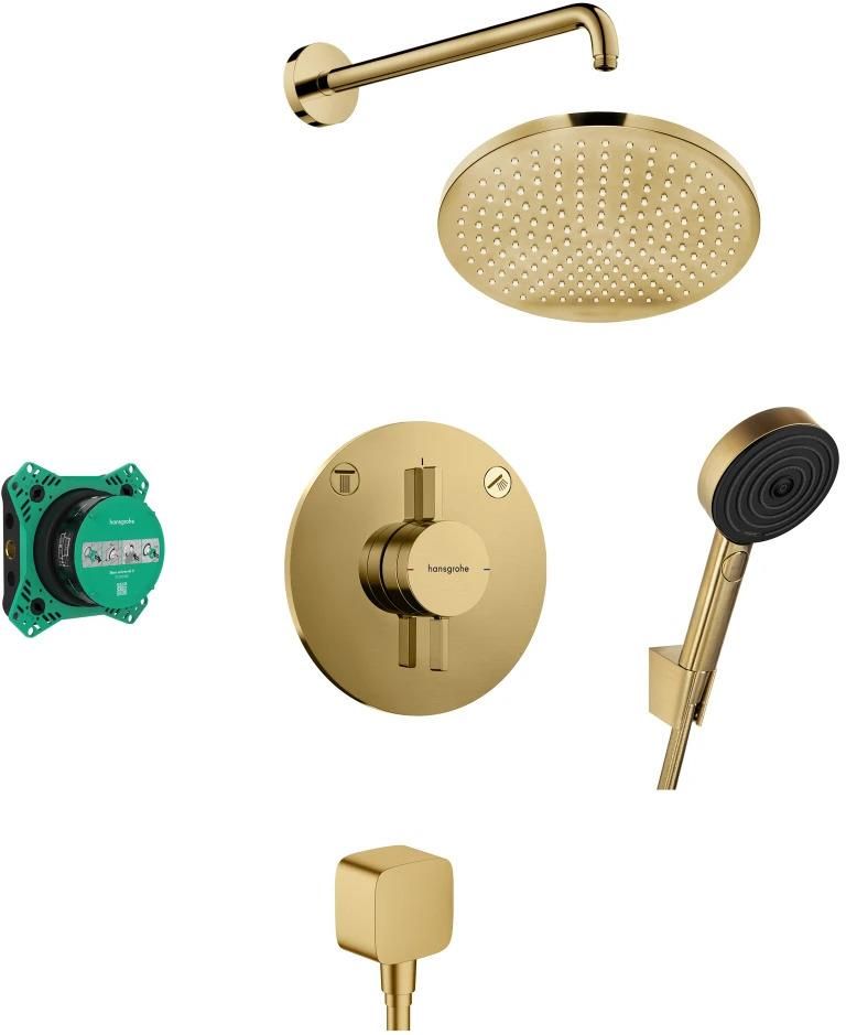 Hansgrohe DuoTurn zestaw prysznicowy 240 1 jet EcoSmart złoty optyczny szczotkowany 88003993 Zestaw składa się z: DuoTurn S baterii z mieszaczem do 2 odbiorników, podtynkowa - 75418250 Zestawu podtynkowego iBox 2 – 01500180 Głowicy prysznicowej Crometta S – 26724250 Ramienia prysznicowego 38,9 cm - 27413250 FixFit Przyłącza węża z zaworem zwrotnym - 26457250 Pulsify Select S punktowego zestawu prysznicowy 105 3jet z wężem 125 cm - 24302250 1. DuoTurn S baterii z mieszaczem do 2 odbiorników, podtynkowa - 75418250 Cechy artykułu 2 odbiorniki regulacja natężenia przepływu i zawór odcinająco - przełączający dla 2 odbiorników maksymalne natężenie przepływu przy 3 barach: 29,5 l/min maksymalne natężenie przepływu przy 1 barze: 15 l/min natężenie przepływu wyjścia górnego: 29,5 l/min głowica ceramiczna do regulacji temperatury, zawór odcinająco-przełączający łatwy montaż ze wstępnie zmontowanym blokiem funkcyjnym uchwyty zawsze w tej samej odległości, niezależnie od głębokości montażu zestawu podstawowego możliwość korekty rozety w zakresie +/- 3° materiał rozety: tworzywo sztuczne materiał uchwytów: metal bateria dostarczana jest z przyciskami: Rain mały, Rain duży, główka prysznicowa, Waterfall i wanna typ przyłącza: zestaw podstawowy iBox universal 2 (nr 01500180) natężenie przepływu wyjścia dolnego: 29,5 l/min 2. Zestawu podtynkowego iBox 2 – 01500180 Cechy artykułu nadaje się do wszystkich nowych prysznicowych, wannowych i termostatycznych elementów zewnętrznych do montażu podtynkowego (ShowerSelect Comfort, Ecostat Comfort, DuoTurn) w połączeniu z adapterem (nr 13588000) kompatybilny z innymi prysznicowymi, wannowymi i termostatycznymi elementami zewnętrznymi materiał: mosiądz DZR, pianka EPP, wygłusza i izoluje termicznie przyłącze gwintowane: Rp ½ wymiar przyłącza: DN15 symetryczna konstrukcja montaż z izolacją akustyczną pierścień montażowy dla różnych warunków montażu pierścień montażowy z regulacją co 5 mm pierścień montażowy przystosowany do montażu od przodu i od tyłu regulowany rękaw eliminuje konieczność jego docinania zintegrowana poziomica zintegrowana poziomica umożliwiająca prawidłowe ustawienie w poziomie i pionie kołnierz uszczelniający trwale zmontowany zasilanie: kanał M16 minimalna głębokość montażu: 80 mm maksymalna głębokość montażu: 108 mm 3. Głowicy prysznicowej Crometta S – 26724250 Cechy artykułu wielkość głowicy: 240 mm rodzaj strumienia: Rain działa prawidłowo od: 4,8 l/min maksymalne natężenie przepływu przy 3 barach: 6,5 l/min głowica prysznicowa z regulowanym kątem materiał tarczy strumieniowej: tworzywo sztuczne montaż: sufit lub ściana przyłącze gwintowane: G ½ nadaje się do przepływowych podgrzewaczy wody Taksonomia UE: max. 8 l/min – nie wyrządza poważnych szkód (DNSH) 4. Ramienia prysznicowego 38,9 cm - 27413250 Cechy artykułu długość: 389 mm sposób montażu: natynkowy materiał: mosiądz typ przyłącza: G ½ wersja: kąt 90° 5. FixFit Przyłącza węża z zaworem zwrotnym - 26457250 Cechy artykułu przyłącze z tworzywa sztucznego materiał osłony: tworzywo sztuczne zawór zwrotny typ przyłącza: G ½ 6. Pulsify Select S punktowego zestawu prysznicowy 105 3jet z wężem 125 cm - 24302250 Cechy artykułu składa się z: główka prysznicowa, uchwyt prysznicowy, wąż prysznicowy wielkość główki: 105 mm rodzaj strumienia: PowderRain, IntenseRain, Strumień Massage wygodny wybór strumienia za pomocą przycisku Select QuickClean: Osad z kamienia można po prostu zetrzeć palcem maksymalne natężenie przepływu przy 3 barach: 6,9 l/min obrotowa nakrętka zapobiega plątaniu się węża długość węża prysznicowego: 1250 mm zintegrowany uchwyt mocowania ścienne wykonane z tworzywa filtr sitkowy z możliwością przepłukania Taksonomia UE: max. 8 l/min – nie wyrządza poważnych szkód (DNSH)