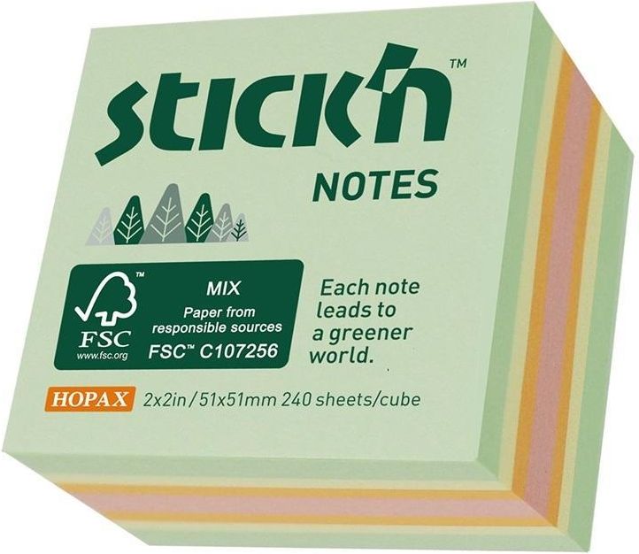Notes kostka FSC 51x51mm pastel ziel/żół/pom/róż 240 kartek STICKN ✅ ✔️ Papierowe notesy kostki wyprodukowane z drewna pozyskanego w ramach zrównoważonej gospodarki leśnej, posiadają certyfikat FSC 107256. Notes kostka o wymiarach 51 x 51 mm zawiera 240 kartek w 4 pastelowych kolorach: zielonym, …