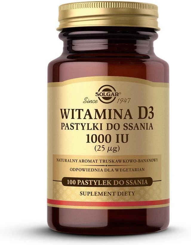 SOLGAR Witamina D3 1000 IU x 100 pastylek do ssania Solgar Witamina D3 to suplement diety w postaci pastylek do ssania, który zawiera 25 mcg witaminy D3 w postaci cholekalcyferolu. Sposób użycia Osoby dorosłe i dzieci powyżej 4. roku życia: 1 pastylkę dziennie. Opakowanie zapewnia 100 dni kuracji. Najlepiej zażywać w trakcie posiłku lub stosować według wskazań lekarza. Nie należy przekraczać porcji zalecanej do spożycia w ciągu dnia. Produkt nie może być stosowany jako substytut zróżnicowanej diety i zdrowego trybu życia. Kobiety w ciąży, matki karmiące oraz osoby zażywające leki lub chore, powinny przed zażyciem preparatu skonsultować się z lekarzem. Skład Składniki aktywne: Witamina D3 (1000 IU, cholekalcyferol) ……25 µg Naturalne substancje pomocnicze: Substancje wypełniające: sacharoza, fruktoza, ksylitol, celuloza mikrokrystaliczna, skrobia spożywcza, maltodekstryna, dekstroza Substancje przeciwzbrylające: roślinny kwas stearynowy, dwutlenek krzemu, sole magnezowe kwasów tłuszczowych (roślinnych) Naturalne aromaty: truskawka, banan Wzmacniacz aromatu: kwas jabłkowy, kwas cytrynowy Informacja alergiczna: Preparat Witamina D3 nie zawiera: glutenu, pszenicy, produktów mlecznych, soi, drożdży, substancji konserwujących, sztucznych substancji aromatycznych i barwiących.