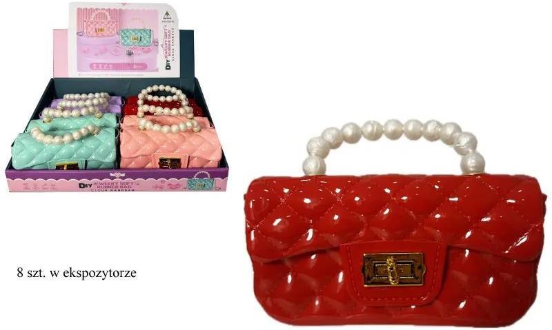 Gumowa torebka z uchwytem przypominającym perełki. W środku torebki znajdują się akcesoria jak: lusterko, grzebień, bransoletka, spinki do włosów, pierścionek. Produkt przeznaczony dla dzieci od 3 lat. Produkt występuje w kilku wersjach kolorystycznych, wybierany losowo. Cena dotyczy jednej sztuki. Wiek: 3+