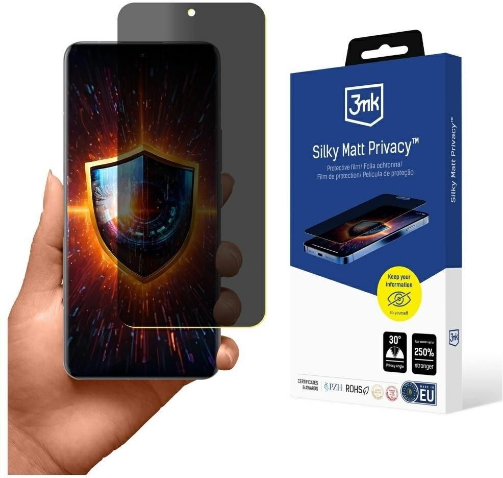 3MK SILKY MATT PRIVACY Prywatyzująca matowa folia na ekran urządzenia Chroni prywatność już od kąta 30 stopni Prywatyzująca folia ochronna 3mk Silky Matt Privacy™ została stworzona z myślą o użytkownikach smartfonów, którzy chcą cieszyć się prywatnością i komfortem podczas korzystania z telefonu w miejscach publicznych. Dzięki zastosowaniu filtra prywatyzującego, wyświetlane na ekranie treści są skutecznie chronione przed wścibskim wzrokiem osób postronnych. Obraz zostaje rozmyty i przyciemniony już od kąta 30o. Nikt, kto stoi obok, nie zobaczy, co właśnie robisz na smartfonie. Poufne informacje zachowujesz wyłącznie dla siebie. Redukuje odbicia światła i odciski palców 3mk Silky Matt Privacy™ charakteryzuje się idealną przejrzystością i wyjątkowym, matowym wykończeniem, co wiąże się z licznymi zaletami praktycznymi. Po pierwsze, matowa powierzchnia odpowiada za niwelowanie odblasków, więc możesz swobodnie, bez nadwyrężania wzroku, obsługiwać smartfona w nasłonecznionych miejscach, np. w parku. Po drugie, zapobiega pozostawianiu nieestetycznych śladów palców, więc korzystasz z czystego i eleganckiego sprzętu. Po trzecie, matowe wykończenie jest cudownie jedwabiste w dotyku, więc praca z telefonem staje się niebywałą przyjemnością. Po czwarte, 3mk Silky Matt Privacy™ nie powoduje efektu „żaluzji”, więc widzisz wszystko wyraźnie. Wzmacnia wyświetlacz nawet o 250% W 3mk Silky Matt Privacy™ troska o Twoją prywatność idzie w parze z dbałością o Twój cenny sprzęt. Nie musisz wybierać, na jakim aspekcie zależy Ci bardziej. Folia zabezpiecza ekran smartfona przed zarysowaniami i innymi uszkodzeniami, do których często dochodzi podczas codziennego użytkowania telefonu. Gwarantuje wzmocnienie wyświetlacza nawet o 250%. Dokładne przyleganie produktu do krawędzi zwiększa poziom ochrony i zapewnia doskonały efekt wizualny. Instalowana na mokro – łatwo i bezpiecznie Prywatyzująca folia ochronna 3mk Silky Matt Privacy™ skrywa jeszcze jeden, ważny atut - szybki i bezproblemowy montaż. Nie potrzebujesz doświadczenia, narzędzi ani specjalnych warunków, by samodzielnie, precyzyjnie zainstalować folię na ekranie smartfona. Aplikacja na mokro zawsze wychodzi perfekcyjnie i jest w 100% bezpieczna dla urządzenia. Żelu montażowego stosujesz tak niewiele, że nie ma szans zalania telefonu. Produkt nie współpracuje z czytnikami linii papilarnych umieszczonymi pod ekranem. Dane Techniczne Rodzaj zabezpieczenia Folia Grubość 0.15 mm Wzmocnienie na uderzenia do 250% Zastosowane technologie kąt prywatyzacji ≤ 30° technologia Self-Heal™ samoregenerująca powłoka oleofobowa warstwa antyuderzeniowa Certyfikaty PZH (bezpieczne dla zdrowia człowieka), RoHS (nie zawiera metali ciężkich) Gwarancja 6 miesięcy W zestawie 1 szt. Silky Matt Privacy™, raszelka, szmatka, żel 10ml, mokra ściereczka, opakowanie