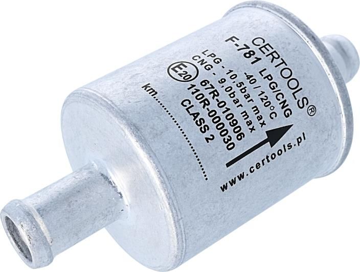 Opis produktu Jednorazowy filtr fazy lotnej model F-781 firmy Certools. Zalecana wymiana filtra co 20 000 km. Opis zastosowania Filtr fazy lotnej przeznaczony do instalacji czwartej generacji sekwencyjnego wtrysku gazu w fazie lotnej. Dane techniczne Jednorazowy filtr w aluminiowym korpusie o długości całkowitej 98 milimetrów. Króciec wejścia gazu o średnicy 14 milimetrów, króciec wyjścia gazu o średnicy 12 milimetrów, wkład filtrujący z włókna szklanego, określony na obudowie kierunek przepływu gazu. Ciśnienie kwalifikacyjne 450 kPa, zakres zalecanej temperatury pracy od -40 do +120 stopni Celsjusza. E20-67R-010906 E20-110R-000030 Cechy produktu Typ filtra: jednorazowy Wkład: włókno szklane Wejście: 14 mm Wyjście: 12 mm Obudowa: metal Sposób montażu: na przewodzie Informacje dodatkowe Kod produktu Nagaz: 32.CRT.766 Producent: CERTOOLS Kod producenta: 55-781-01412SG Numer homologacji: E20-67R-010663
