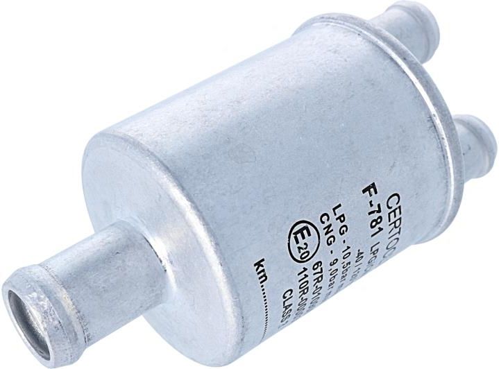 Opis produktu Jednorazowy filtr fazy lotnej model F-781 firmy Certools. Opis zastosowania Filtr fazy lotnej przeznaczony do instalacji czwartej generacji sekwencyjnego wtrysku gazu w fazie lotnej. Dane techniczne Jednorazowy filtr w aluminiowym korpusie o długości całkowitej 98 milimetrów. Króciec wejścia gazu o średnicy 16 milimetrów, dwa króćce wyjścia gazu o średnicy 12 milimetrów, wkład filtrujący z włókna szklanego, określony na obudowie kierunek przepływu gazu. Ciśnienie kwalifikacyjne 450 kPa, zakres zalecanej temperatury pracy od -40 do +120 stopni Celsjusza. E20-67R-010906 E20-110R-000030 Cechy produktu Typ filtra: jednorazowy Wkład: włókno szklane Wejście: 16 mm Wyjście: 2 x 12 mm Obudowa: metal Sposób montażu: na przewodzie Informacje dodatkowe Kod produktu Nagaz: 32.CRT.862 Producent: CERTOOLS Kod producenta: 55-781-016212SG Numer homologacji: E20-67R-010906