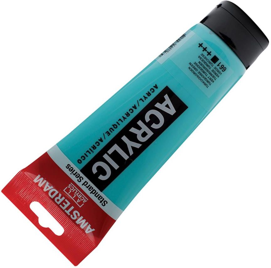 Farba akrylowa Amsterdam Acrylic 250 ml - 661 Turquoise green Farby Amsterdam Acrylic firmy Royal Talens tworzone są w 100% z emulsji akrylowej z dodatkiem wysokich jakości pigmentów. Są praktycznie pozbawione zapachu a po wyschnięciu – elastyczne i odporne na spękania. Kremowa konsystencja farb Amsterdam minimalizuje pozostawiane przez pędzle ślady pociągnięć. Charakteryzują się bardzo krótkim czasem schnięcia oraz wysoką światłoodpornością. Zamknięte w wygodnej plastikowej tubce lub – w przypadku większych pojemności – plastikowej butelce.