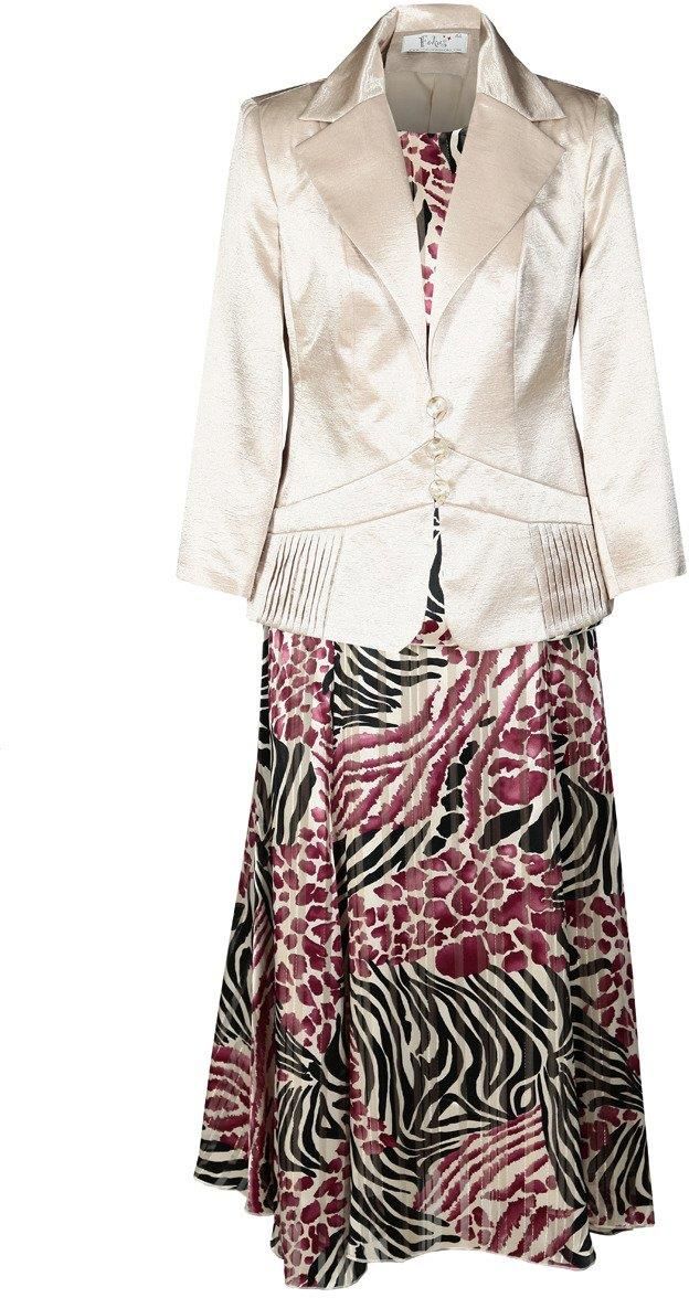 Spódnica: dł. 7/8, rozkloszowana, godety suwak kryty z tyłu tk. wzorzysta, podszewka Bluzka: dekolt okrągły suwak kryty z boku rękaw motylek tk. wzorzysta, podszewka Żakiet: dekolt szpic, kołnierz zapięcie guziki rękaw 3/4 tk. z połyskiem, podszewka