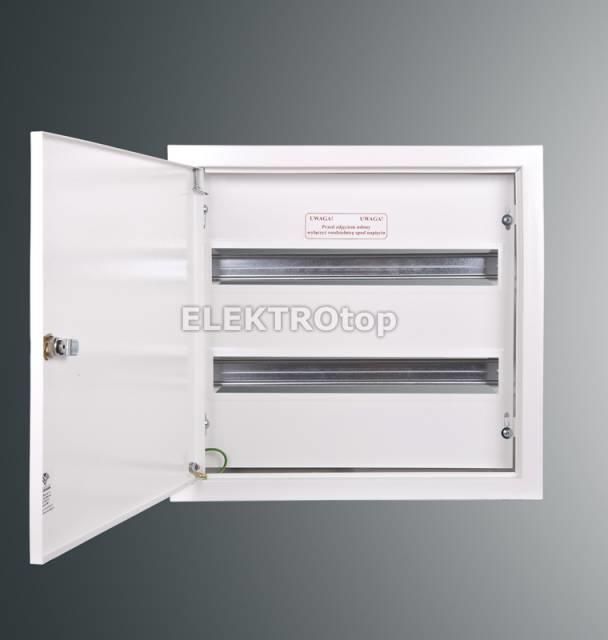 Zastosowanie Rozdzielnice RW są konstrukcjami stanowiącymi bezpieczną i estetyczną obudowę dla montowania w nich zespołów bezpiecznikowych typu "S", liczników jedno i trójfazowych oraz urządzeń sterujących. Nadają się do montowania wewnątrz budynków. Budowa Blacha stalowa o grubości 0,8mm malowana proszkowo na kolor biały RAL 9003. Do malowania używana jest najwyższej jakości farba poliestrowo-epoksydowa. Sposób montażu Do montowania w ścianie. Parametry techniczne napięcie znamionowe izolacji: Ui=500V stopień ochrony: IP30 wymiary: 392x423x130 Wyposażenie szyny TH 35 - ilość modułów 2x20S zaciski ochronne PE i N przewód ochronny PE do drzwi zamek patentowy - kod 9081 zestaw naklejek obudowa bez tylnej ściany