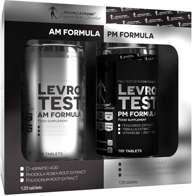 Levrone Levro Test ( AM PM Formula 2x 120 ) 240tab Suplement diety. Dwufazowy preparat polecany ciężko trenującym mężczyznom, w okresach długotrwałego wysiłku fizycznego, a także w okresach zmęczenia oraz spadku formy. LevroTest AM Formula to formuła dzienna, zawierająca ekstrakty roślinne (Rhodiola, polygonum), kwas D-asparaginowy, kwas foliowy oraz witaminy D, B6 i B12. Witamina D, B12 oraz kwas foliowy pomagają w prawidłowym funkcjonowaniu układu odpornościowego. Witamina B6 oraz B12 przyczyniają się do zmniejszenia uczucia zmęczenia i znużenia. LevroTest PM Formula to formuła do stosowania przed snem, oparta na ekstraktach z Tribulusa i kozieradki, wzbogacona o cynk, magnez i witaminę B6. Cynk pomaga w utrzymaniu prawidłowego poziomu testosteronu we krwi. Witamina B6 przyczynia się do regulacji aktywności hormonalnej. Magnez przyczynia się do utrzymania prawidłowego metabolizmu energetycznego. AM FORMULA LevroTest AM Formula. Suplement diety. LevroTest AM Formula to formuła dzienna, zawierająca ekstrakty roślinne, kwas D-aspa­raginowy, kwas foliowy oraz witaminy D, B6 i B12, przeznaczona dla zdrowych osób dorosłych, do 75 roku życia. Witamina D, B12 oraz kwas foliowy pomagają w prawidłowym funkcjonowaniu układu odpornościowego. Witamina B6 oraz B12 przyczyniają się do zmniejszenia uczucia zmęczenia i znużenia. Składniki: Kwas D-asparaginowy (DAA), substancje wypełniające (E460(i), E341), maltodekstryna, substancje wiążące (E464, E422), substancje przeciwzbrylające (E470b, E551, E553b), ekstrakt z korzenia żeń-szenia (Panax ginseng C.A. Mey.), ekstrakt z korzenia rdestu japońskiego (Fallopia japonica (Houtt). Ronse Dec.; 50% reswe­ratrolu), witamina D (cholekalcyferol), witamina B6 (chlorowo­dorek pirydoksyny), witamina B12 (cyjanokobalamina), kwas foliowy (kwas pteroilomonoglutaminowy), stabilizator (E1202), substancja glazurująca (E1521). Zalecany sposób spożycia: Spożywać 5 tabletek dziennie (3 rano, 2 w ciągu dnia lub przed treningiem) przez 12 dni. Zrobić 3 dni przerwy i ponownie po­wtórzyć 12 dniowy cykl stosowania. Uwagi: Nie spożywać w przypadku uczulenia na którykolwiek ze składników produktu. Nie przekraczać zalecanej do spożycia dziennej porcji produktu. Suplement diety nie może być stosowany jako zamiennik zróżnico­wanej diety. Zalecany jest zrównoważony sposób żywienia i zdro­wy tryb życia. Przed zastosowaniem wskazane jest wykonanie badania 25-(OH)D we krwi oraz konsultacja wyniku badania z leka­rzem lub farmaceutą. Produkt nie powinien być spożywany przez kobiety w ciąży i matki karmiące. Przechowywać w sposób nie­dostępny dla małych dzieci. W przypadku przyjmowania leków przed spożyciem produktu zalecana jest konsultacja z lekarzem. Najlepiej spożyć przed końcem, numer partii produkcyjnej (patrz na opakowaniu). Przechowywać w suchym miejscu, w temperaturze pokojowej (15-25°C). Chronić przed światłem. Nie zamrażać. Dzienna porcja: 5 Tabletek Ilość porcji w opakowaniu:24 Zawartość w5 TabletkachKwas D-asparaginowy3120 mgEkstrakt z korzenia żeń-szenia100 mgEkstrakt z korzenia rdestu japońskiego (50% resweratrolu)100 mg (50 mg)Witamina B62 mg (143% NRV)Kwas foliowy400 µg (200% NRV)Witamina D25 µg (500% NRV)Witamina B126 µg (240% NRV) Masa netto: 120 tabletek (180 g) PM FORMULA LevroTest PM Formula. Suplement diety. LevroTest PM Formula to formuła przeznaczona do stosowania przed snem, zawierająca ekstrakty roślinne, cynk oraz witaminę B6, przeznaczona dla osób dorosłych. Cynk pomaga w utrzymaniu prawidłowego poziomu testosteronu we krwi. Witamina B6 przyczynia się do regulacji ak­tywności hormonalnej. Składniki: kompleks ekstraktów [ekstrakt z nasion kozieradki pospolitej (Trigonella foenum-graecum L.), ekstrakt z owoców buzdyganka naziemnego (Tribulus terrestris L.; (90% saponin)], substancje wypełniające (E460(i), E341), mal­todekstryna, sole magnezowe kwasu cytrynowego, substancje przeciwzbrylające (E470b, E551, E553b), substancja wiążąca (E464), stabilizator (E1202), siarczan cynku, witamina B6 (chlorowodorek pirydoksyny), substancja glazurująca (E1521), barwnik (E172). Zalecany sposób spożycia: Spożywać pół tabletki przed snem, popijając wodą. Uwagi: Nie spożywać w przypadku uczulenia na którykolwiek ze składników produktu. Nie przekraczać zalecanej do spożycia dziennej porcji produktu. Suplement diety nie może być stosowany jako zamiennik zróżnicowanej diety. Zalecany jest zrównoważony sposób żywienia i zdrowy tryb życia. Produkt nie powinien być spożywany w przypadku stosowania leków na nadci­śnienie lub cukrzycę. Nie stosować u dzieci, kobiet w ciąży i w trakcie laktacji. Przechowywać w sposób niedostępny dla małych dzieci. W przypadku przyjmowania leków przed spożyciem produktu zalecana jest konsultacja z lekarzem. Najlepiej spożyć przed końcem, numer partii produkcyjnej (patrz na opakowaniu). Przechowywać w suchym miejscu, w temperaturze pokojowej (15-25°C). Chronić przed światłem. Nie zamrażać. Dzienna porcja: ½ Tabletki Ilość porcji w opakowniu: 240 Zawartość w½ tabletkiEkstrakt z nasion kozieradki pospolitej137,5 mgEkstrakt z owoców buzdyganka naziemnego (90% saponin)125 mg (112,5 mg)Cynk1,9 mg (19% RWS)Witamina B61,25 mg (89% RWS) Sposób przechowywania: Przechowywać w suchym pomieszczeniu w zamkniętym opakowaniu w temp 15-25°C w miejscu niedostępnym dla małych dzieci. Ostrzeżenia: Nie należy przekraczać zalecanej porcji do spożycia w ciągu dnia. Produkt nie może być stosowany jako substytut zróżnicowanej diety. Dla utrzymania prawidłowego stanu zdrowia należy stosować zróżnicowaną dietę i prowadzić zdrowy tryb życia. Preparat nie jest przeznaczony dla dzieci,kobiet w ciąży oraz karmiących.Tartrazyna, może mieć negatywny wpływ na aktywność i skupienie uwagi u dzieci. Najlepiej spożyć przed końcem,numer partii produkcyjnej : patrz spód 