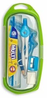 Opis szczegółowy zestaw skłąda się z 8 elementów:metalowy cyrkiel, ołówek, linijka 15 cm, dwie ekierki, kątomierz, temperówka i gumka. Całość spakowana w wygodne etui Parametry produktu Rodzaj: Cyrkiel-zestaw m-ti Waga brutto: 30 g Liczba opakowań konsumenckich: 1 szt. Liczba opakowań pierwszego rzędu na warstwie palety: 10 op. zb. (DU) Waga jednostkowa brutto: 0,03 kg Kod CN: 9017 30 00 Liczba warstw na palecie: 8 warstw (warstwa) Wymiar opakowania (SxWxG): 7 x 16,5 x 2,5 cm Wysokość palety: 50 cm Liczba opakowań pierwszego rzędu na palecie: 144 op. zb. (DU) Typ opakowania konsumenckiego: Pudełko