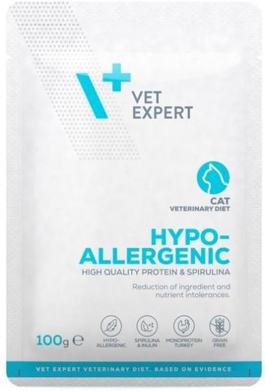 VetExpert Veterinary Diet Hypoallergenic 100g Hipoalergiczna Mokra Karma Weterynaryjna Dla Kota Z Indykiem Nowa, wygodna forma saszetki, ta sama wysoka jakość produktu! Pełnoporcjowa i zbilansowana karma dietetyczna dla kotów dorosłych, przeznaczona do wspomagania w objawach nietolerancji …
