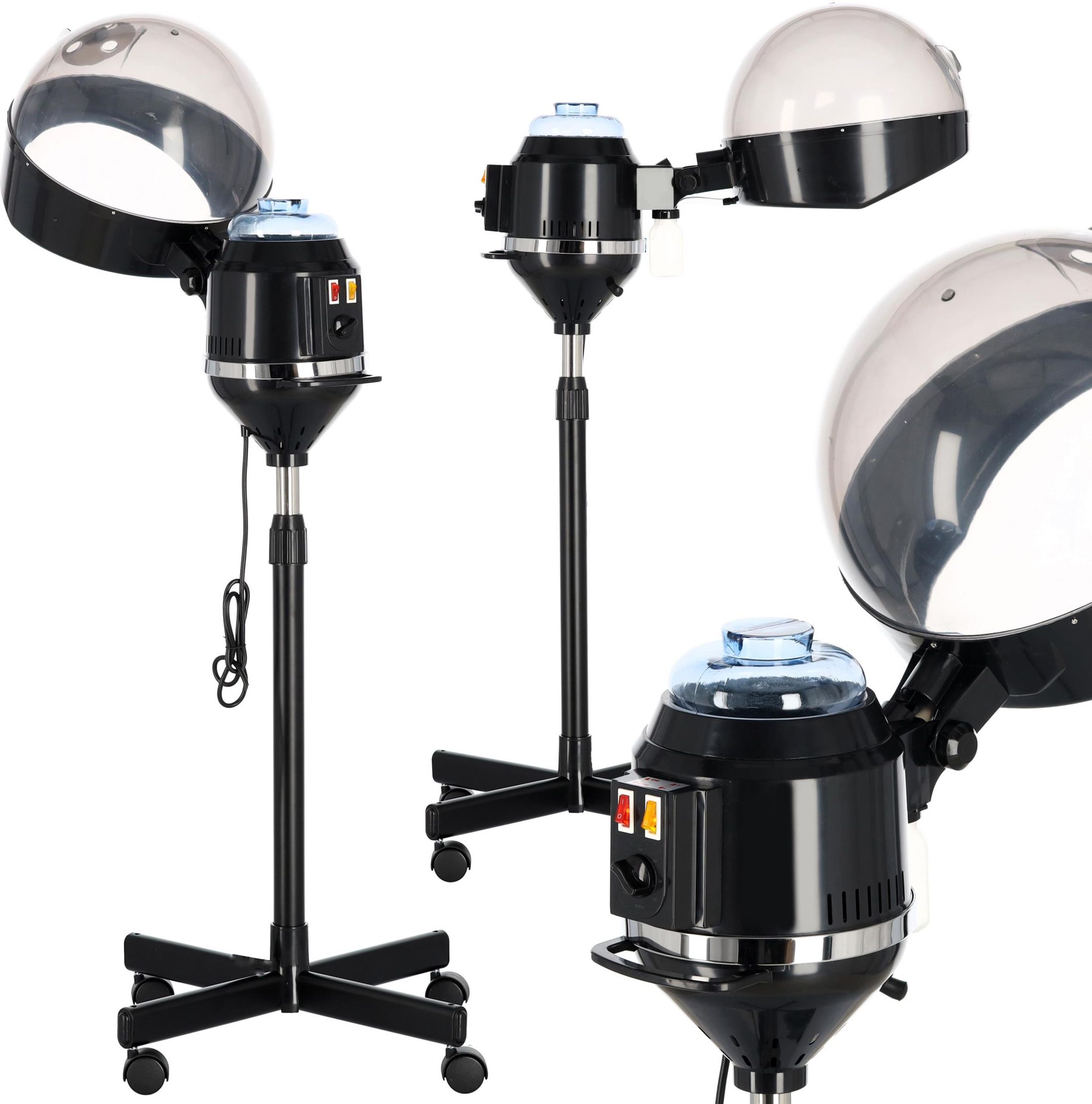 Zdjęcie podglądowe faktyczny produkt może posiadać delikatne różnice wizualne. Sauna Calissimo na statywie Jest to innowacyjne urządzenie służące do głębokiej odbudowy włosów. Ciepła para wodna wytwarzana przez nawilżacz/saunę do włosów pozwala mikro – komórkom włosów rozszerzać się, co ułatwia dokładniejsze wchłanianie przez nie substancji zawartych w różnego rodzaju preparatach fryzjerskich. Polega to, w skrócie mówiąc, na rozchyleniu łusek włosa i wtłoczenie środków pielęgnujących do jego głębi. Mogą to być środki nawilżające (np. arganowe maski do włosów) lub odbudowujące (np. keratynowe ampułki czy maski, wypełniają ubytki w strukturze włosa). Dane techniczne Ręczne sterowanie Nawiew Pojemny zbiornik na wodę Stabilna czteroramienna podstawa Wymiar urządzenia: 43 cm x 25 cm x 35 cm Dodatkowo instrukcja w zestawie