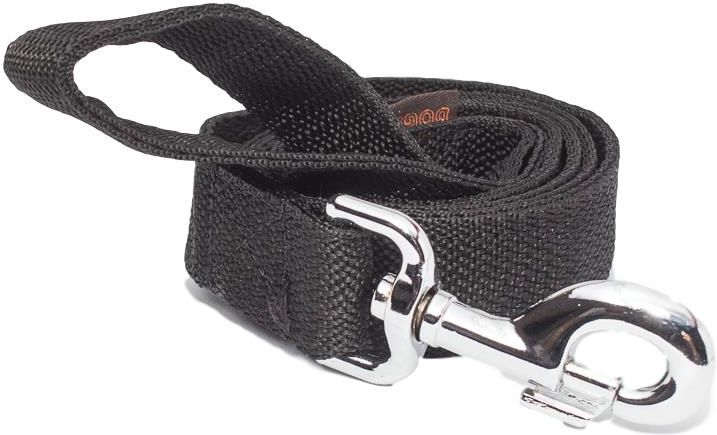 Smycz z taśmy Prosta, elegancka smycz uszyta z podwójnie złożonej czarnej taśmy. Wyposażona w mocny karabinek, z wygodnym uchwytem, który pozwala pewnie utrzymać smycz w dłoni. Szerokość taśmy 2,5cm. Długość smyczy 120cm Smycz można skompletować z obrożą w czerwono-czarną kratę.
