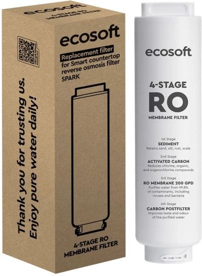 ECOSOFT SPARK wkład do dystrybutora wody RO 4w1 Wkład filtrujący do dystrybutora wody Ecosoft SPARK Odpowiada za oczyszczanie wody w urządzeniu i gwarantuje, że woda, którą pijesz, jest czysta, świeża i smaczna. Dzięki czterostopniowej filtracji usuwa większość zanieczyszczeń z wody i zapewnia prawidłową pracę SPARK nawet przez 24 miesiące. Wkład wykorzystuje 4-stopniową filtrację Sedymentacyjny - zatrzymuje zawiesiny i drobne cząsteczki Węgiel aktywny - redukuje chlor, związki organiczne i poprawia smak wody Membrana RO (200 GPD) - usuwa do 99,8% zanieczyszczeń, w tym metale ciężkie, TDS, bakterie oraz niepożądane aromaty Postfiltr węglowy - nadaje wodzie finalną klarowność i świeżość Efektem jest perfekcyjnie czysta, neutralna smakowo woda, idealna do picia, przygotowywania napojów i gotowania. Łatwa wymiana w systemie twist-and-lock bez narzędzi bez rozkręcania obudowy bez ryzyka rozlania wody System twist-and-lock sprawia, że każdy użytkownik może wykonać wymianę samodzielnie, czysto i wygodnie. Specyfikacja techniczna Typ filtra: wkład RO 4-stopniowy (sedymentacyjny, węgiel aktywny, membrana RO, postfiltr węglowy) dedykowany do pracy z wodą wodociągową o TDS ≤ 250 mg/L Kompatybilność: Ecosoft SPARK Wydajność: do 4000 litrów wody Membrana RO: 200 GPD Czas wymiany: co 24 miesiące Warunki pracy: woda wodociągowa o TDS ≤ 250 mg/L Montaż: szybki system twist-and-lock kompatybilny wyłącznie z Ecosoft SPARK Wkład zapewnia do 24 miesięcy uzdatniania lub do 4000 litrów przefiltrowanej wody CSV1200BSHASECO