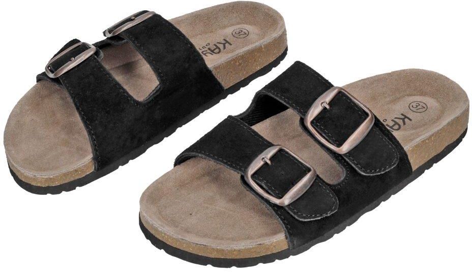 Sandały ekologiczne ze skóry naturalnej.Te klasyczne kapcie marki Bluewear mają miękką podeszwę wewnętrzną ze skóry i dwa regulowane paski ze sprzączką, dzięki czemu są niezwykle wygodne w użyciu. Cholewkę wykonano z zamszu bydlęcego, a podeszwę z tworzywa.