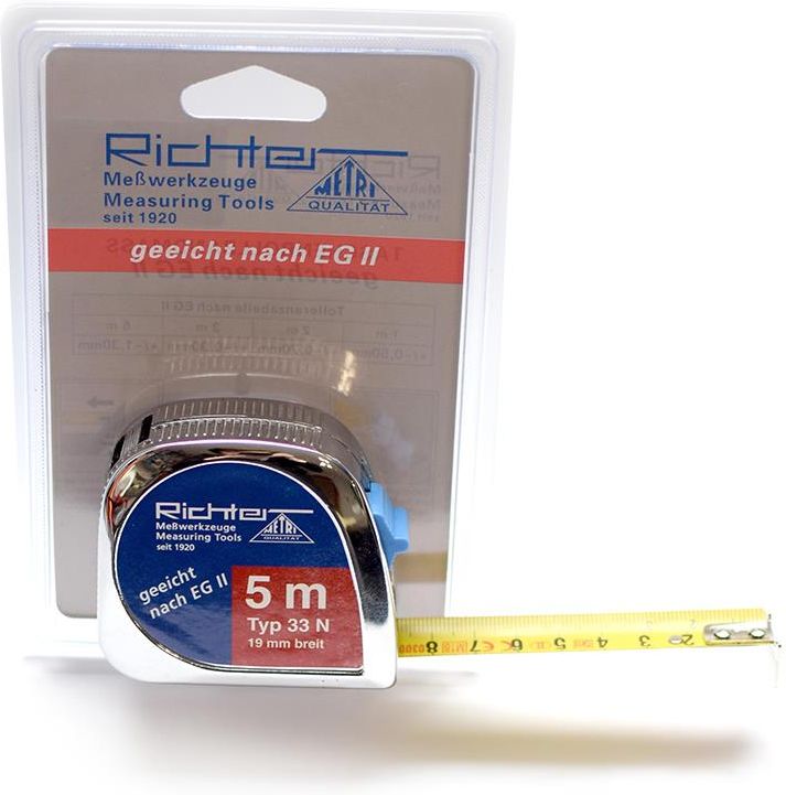 Stalowa taśma 5m niemieckiej firmy RICHTER wykonana z niełamliwego i odpornego na korozję i odkształcenia stopu stali lakierowanej na żółto. Obudowa typu “33N” wykonana z chromowanego tworzywa sztucznego, odpornego na uderzenia. Obudowa szczelnie zespolona. Przycisk blokady w obudowie, automatyczne zwijanie, metalowy zaczep do pasa. Podział na górnej i dolnej krawędzi cm w kolorze czarnym, a liczby dziesiętne na czerwono. Parametry Typ taśmy: 33N Kolor: żółta Szerokość taśmy: 19mm Długość taśmy: 5m Przymiar zgodny ze standardami UE w II klasie dokładności +/- 1,30mm.
