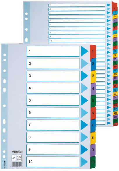 Wytrzymałe przekładki, utrzymane w żywej tonacji kolorystycznej. Wierzchnia karta z wydzielonymi, dużymi powierzchniami na opis przekładek. Mocne, wytrzymałe przekładki wzmocnione folią Mylar Wzmocniony perforowany pasek na karcie opisowo-informacyjnej 10 zadrukowanych numerycznie indeksów (1-10) do łatwego sortowania 11 uniwersalnych otworów umożliwiających wpinanie do segragatora Format A4 Mocny karton o gramaturze 160 gsm Specyfikacja: Kolor Wielobarwny Wymiary 225 x 3 x 297mm Format A4 Rodzaj indeksu 1-10 Waga 0,12kg ESSELTE - NIEZAWODNE ROZWIĄZANIA ORGANIZACYJNE Każdy produkt Esselte jest zaprojektowany z myślą o funkcjonalności i łatwości obsługi. Jest dzięki temu jedną z najbardziej zaufanych europejskich marek w zakresie segregatorów i wielu innych produktów ułatwiających dobrą organizację pracy. W ofercie Esselte znajdziesz produkty takie jak: Teczki Segregatory Gazetowniki Obwoluty Kosze na śmieci Kartony archiwizacyjne
