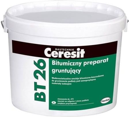 Emulsja Bitumiczna Ceresit BT-26 Ceresit BT 26 służy do zwiększania przyczepności stosowanych na zimno, samoprzylepnych membran izolacyjnych, np. Ceresit BT 21. Do stosowania na zewnątrz budynków, na nasiąkliwe podłoża mineralne, np. betony o zwartej strukturze (klasa wytrzymałości co najmniej C …