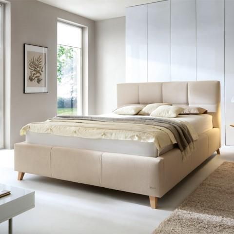 Wygodne tapicerowane łóżko Sara Comforteo ze stylowym zagłówkiem dostępnym w różnych wymiarach.