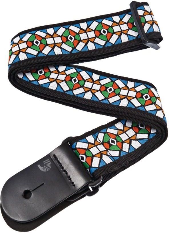 Throw the D'Addario Stained Glass strap on your favorite guitar and get ready to play "Jimi" style with this retro design. Designed for players of all genres, D'Addario woven straps offer designs that will please even the most discerning player. From iconic themes to unique patterns and artwork, these durable straps are sure to accent any guitar and are adjustable from 35" to 59.5" long. Adjustable from 35" to 59.5" long Provides maximum comfort for standing situations Strong and secure leather ends Pattern also available with Planet Lock end
