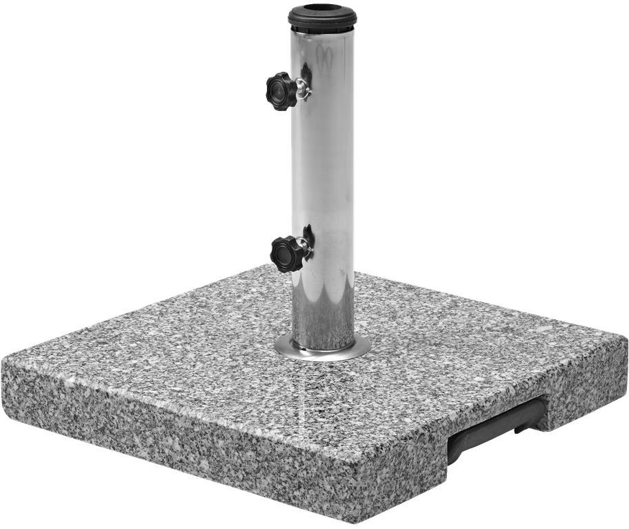 Produkt wykonany z polerowanego granitu z rurą ze stali nierdzewnej. Wyposażona w uchwyt i kółka ułatwiające przemieszczanie. W zestawie z trzema przejściówkami do parasola.
