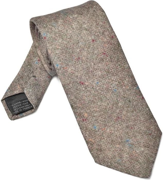 Elegancki krawat w kolorze beżowego melanżu. Na krawacie widoczne są drobne, kolorowe kropeczki. Krawat wykonany jest z wełny połączonej z jedwabiem. Jest bardzo elegancki, a jednocześnie pasuje do casualowych i sportowych stylizacji. Szyty ręcznie we Francji. 70% wełna 30% jedwab