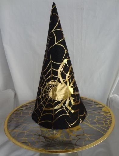 KAPELUSZ WIEDŹMY ZŁOTY Oferujemy elegancki kapelusz wiedźmy w kolorze czarnym, zdobiony wyjątkowym złotym nadrukiem przedstawiającym pająki oraz pajęczyny. Jest to idealny element zarówno samodzielny, jak i świetne uzupełnienie kostiumu na Halloween, bal karnawałowy, wieczór panieński, kawalerski …