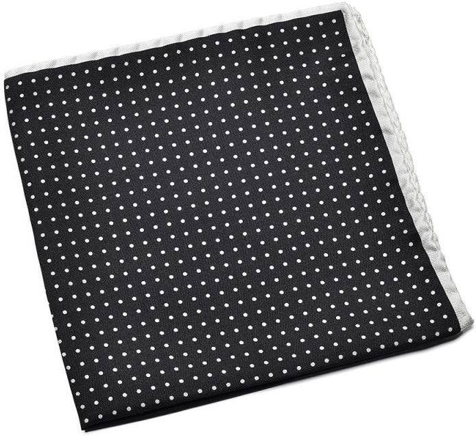 Czarna poszetka VAN THORN w białe kropeczki. Poszetka ma białą obwódkę. Będzie dobrze wyglądać z szarym i czarnym garniturem. Jest bardzo klasyczna, idealnie nadaje się na prezent dla eleganckiego mężczyzny. Poszetka ma ręcznie rolowane brzegi. Materiał: Jedwab 100%