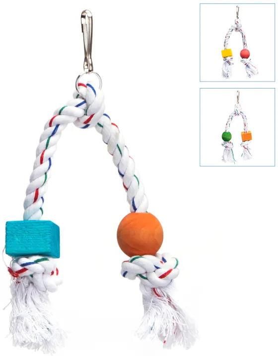 Wymiary: L20*W10cm Kolor produktu: Mieszanka 3 kolorów Dla: Ptaków Materiał wykonania: Bawełniana lina, drewniany klocek Za pomocą klipsa można go wygodnie i pewnie zawiesić. Wykonany jest z kolorowej i przyjaznej dla środowiska liny bawełnianej o dobrej odporności na zużycie, wykonanej z …