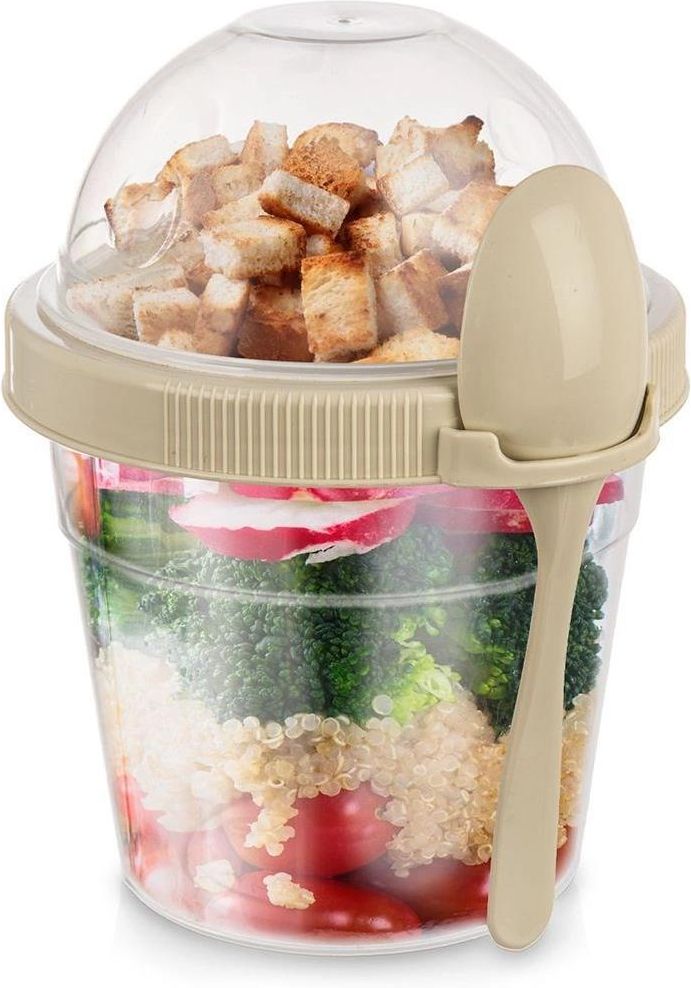 Pojemnik na jogurt z łyżeczką 400ml Pojemnik na jogurt z łyżeczką i miseczką na musli, ułatwia organizację posiłków na co dzień. Wykonany z wytrzymałych materiałów. Dzięki niemu można mieć jogurt oraz ulubione dodatki w jednym miejscu. Posiada szczelne zamknięcie z dodatkowym pojemnikiem, co zapewni komfort użytkowania. Jest łatwy do przenoszenia i mieści się w większości torebek, plecaków czy lunchboxów. Doskonale sprawdzi się w podróży. Cechy PRZYDATNY - Praktyczny pojemnik do przechowywania i spożywania jogurtu z dodatkami. Pojemnik ma pojemność 400 ml i wymiary 11,5 x 10,5 x 13,5 cm. Wyposażony w miseczkę na płatki lub musli o pojemności 150 ml oraz małą łyżeczkę o długości 12 cm. WYTRZYMAŁY - Wykonany z wysokiej jakości tworzywa w przezroczystym kolorze, z elementami w kolorze beżowym. Przezroczysty kolor pozwoli na wygodne sprawdzenie zawartości pojemnika, bez konieczności otwierania go. Pojemnik nadaje się do mycia w zmywarce do naczyń, można bez pokrywki używać w mikrofalówce oraz mrozić w nim produkty. Odporny na temperatury -25 do +25°C. Nie zawiera BPA. SZCZELNY - Pozwala na przechowywanie jogurtu lub innych przekąsek. Dodatkowy pojemnik sprawdzi się do przechowywania owoców, musli, płatków, orzechów lub innych dodatków do jogurtu. Pojemnik nadaje się również do sałatek owocowych i warzywnych. WYGODNE UŻYTKOWANIE - Pojemnik jest wyposażony w pokrywkę, która zapewnia szczelne zamknięcie. Obręcz pozwala na wygodne przymocowanie łyżeczki do pojemnika, dzięki czemu możemy spożywać zawartość pojemnika w dowolnym miejscu. Pojemnik jest dwupoziomowy, co pozwoli oddzielić dodatki od jogurtu czy składniki sałatek. UNIWERSALNY - Kubek pozwoli zabrać ze sobą ulubione dania do pracy, szkoły, na piknik czy wyjazd.