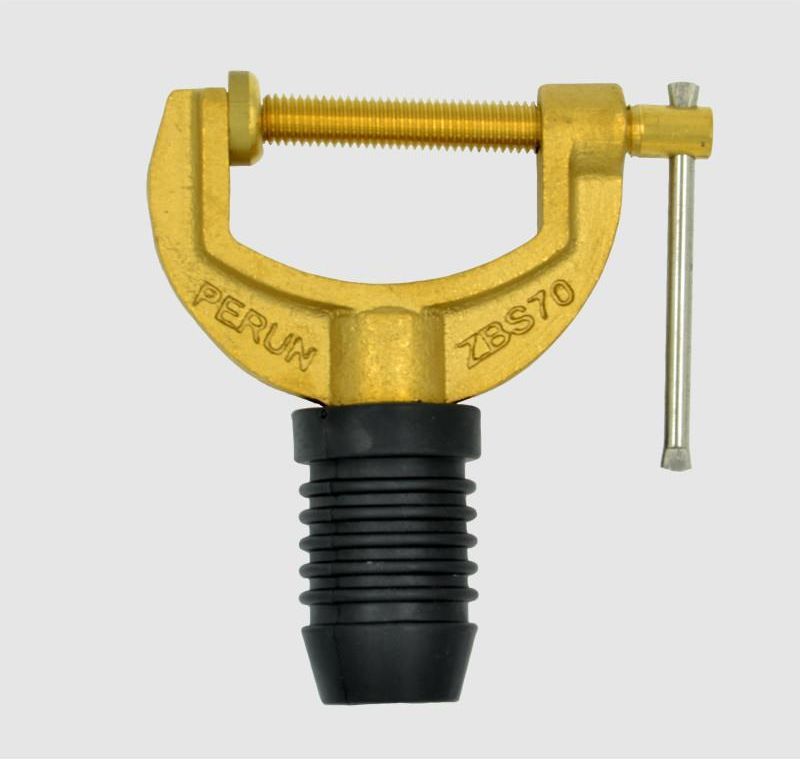 Zacisk biegunowy typ ZBS-70 do przewodu o przekroju 70 mm2. Maksymalny prąd spawania 300 A (cykl 60%) / 400 A (cykl 35%). SZCZEGÓŁYZacisk biegunowy składa się z mosiężnej obejmy, śruby z przetyczką oraz gumowej osłony w miejscu mocowania przewodu spawalniczego. Przewód spawalniczy jest mocowany przy pomocy wkręta specjalnego. Dokręcanie śruby powoduje prawidłowy kontakt elektryczny przewodu spawalniczego ze spawanym materiałem. Wykonanie zacisku z mosiądzu zapewnia właściwą trwałość eksploatacyjną. Zaciski oznaczone są nazwą producenta, typem zacisku i numerem kolejnym. ZASTOSOWANIE Zacisk biegunowy służy do pewnego i szybkiego mocowania przewodu spawalniczego typu OSI 250V lub OS2 250V (kat. SWW 1123 lub równorzędnego), jako jednego z biegunów spawarki (prostownika spawalniczego) do materiału spawanego lub stołu spawalniczego.