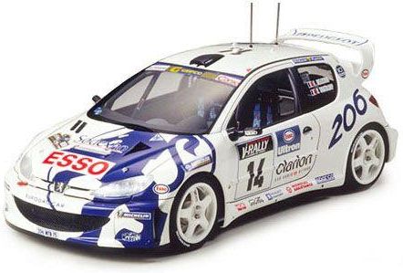 Tamiya 1:24 Peugeot 206 WRC Numer katalogowy: 24221 Zestaw proponowany przez firmę Tamiya zawiera plastikowy model do sklejania samochodu wyścigowego marki Peugeot w skali 1:24. Elementy plastikowe należy wyciąć z ramek, dopasować oraz skleić zgodnie z dołączoną instrukcją montażu. Po sklejeniu należy pomalować farbkami modelarskimi zgodnie z proponowanym schematem malowania, który znajduje się również w instrukcji. Należy pamiętać, że niektóre elementy wymagają malowania jeszcze przed sklejeniem. Następnie należy nanieść dołączone do zestawu kalkomanie zgodnie z oznaczeniami lub grafikami. Zestaw zawiera następujące elementy: Instrukcja montażu. Ramki plastikowe zawierające części plastikowe. Arkusz z kalkomanią. Gumowe koła. Elementy przeźroczyste. Siatka. Zestaw NIE zawiera farb i kleju. Oto podstawowe narzędzia i materiały potrzebne do wykonania modelu: Cążki do wycinania elementów plastikowych. Nożyk modelarski. Pilnik lub papier ścierny. Klej do modeli plastikowych. Pędzelek lub aerograf. Farby modelarskie.