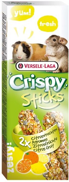 VERSELE-LAGA Crispy Sticks Citrus Fruit to kolba dla kawii domowych i szynszyli, dostarczająca zwiększonej porcji witaminy C. Przysmak zbożowo – owocowy jest wypiekany w tradycyjnych piecach i wzbogacony miodem o silnych właściwościach antybakteryjnych. Dodatek owoców takich jak cytryny i pomarańcze zwiększa smakowitość pokarmu, a jednocześnie zapewnia witaminę C, niezbędną w codziennej diecie kawii domowych. Ziarna zbóż i nasiona są źródłem białka, energetycznych węglowodanów oraz wielu witamin i minerałów. Przysmaki VERSELE-LAGA Crispy Sticks Citrus Fruit w postaci kolb, są umieszczone na drewnianych patyczkach, które mogą służyć gryzoniom do ścierania stale odrastających zębów. Kolby są dostępne w opakowaniu o wadze 55g lub 110g.
