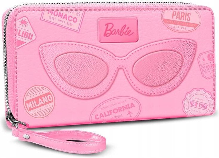 Barbie portfel damski Przepiękny portfel damski. Wymiary: 20 x 10 x 2,5 cm W środku trzy kieszenie. Dwie boczne na banknoty i karty kredytowe oraz środkowa zapinana na zamek.