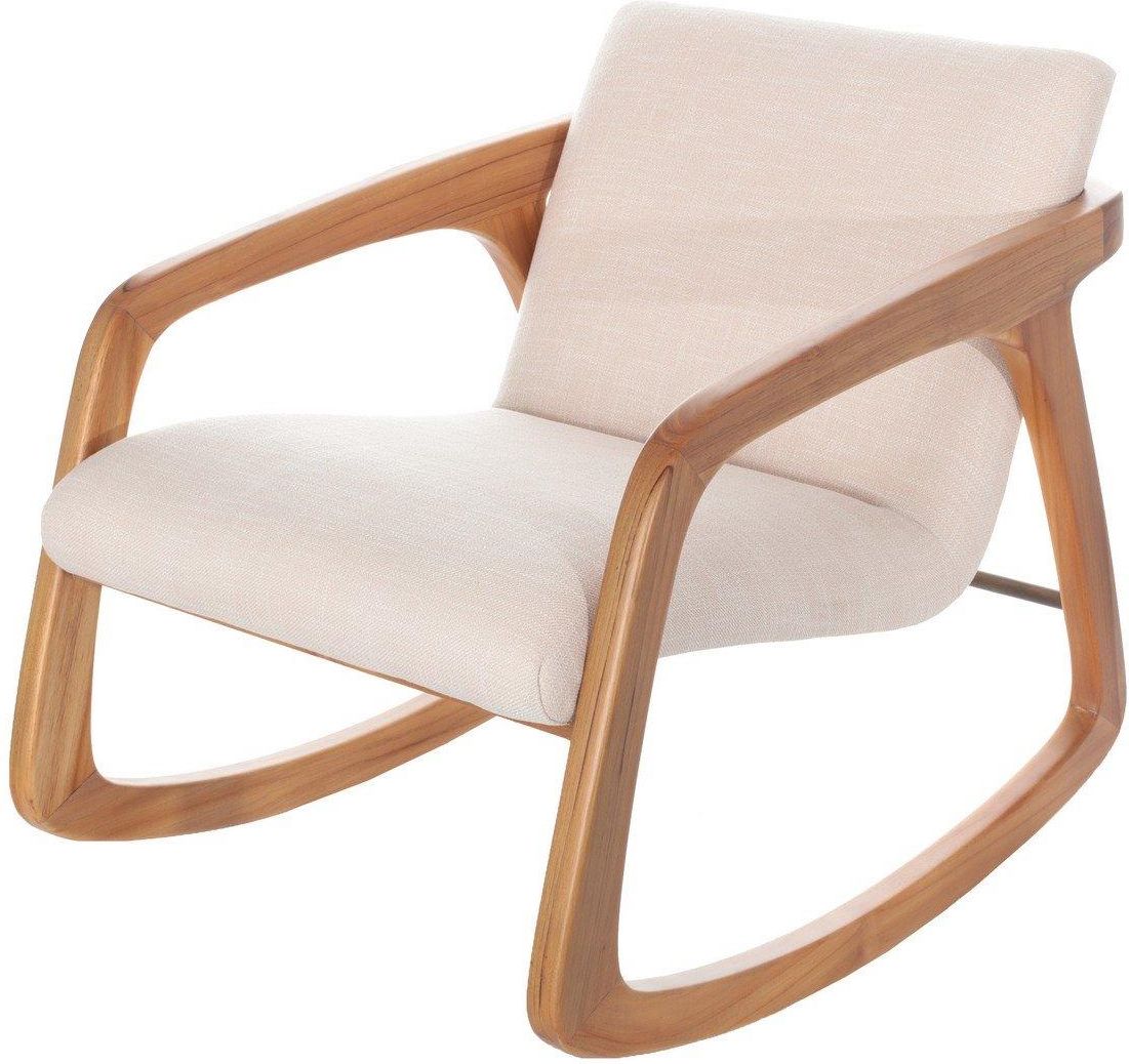 Fotel bujany z drewna tekowego i tkaniny obiciowej w delikatnym beżowo-kremowym kolorze. Fotel bujany z drewna tekowego to wyraz luksusu i elegancji. Ten praktyczny mebel zachwyca swoim wyjątkowym połączeniem materiałów i designu. Drewno tekowe, znane z wyjątkowej trwałości i naturalnego piękna, stanowi solidne podparcie dla wygodnego siedziska. Tkanina obiciowa w beżowo-kremowym odcieniu nadaje całości subtelnego, klasycznego charakteru. Fotel Treston to niezwykle elegancki dodatek do wnętrza, a zarazem miejsce relaksu. Wygodne siedzisko, podłokietniki oraz wyprofilowane oparcie zapewniają komfort podczas wypoczynku. Fotel bujany doskonale sprawdzi się w salonie, sypialni czy pokoju dziecka. Drewniany fotel bujany do salonu to idealne połączenie funkcjonalności i estetyki – stworzy elegancką strefę relaksu, która przyciągnie uwagę i zapewni wyjątkowy komfort w Twoim wnętrzu. Wymiary: szer. 64 cm, dł. 59 cm, wys. 72 cm. Materiał: drewno tekowe, tkanina obiciowa 100% poliester.