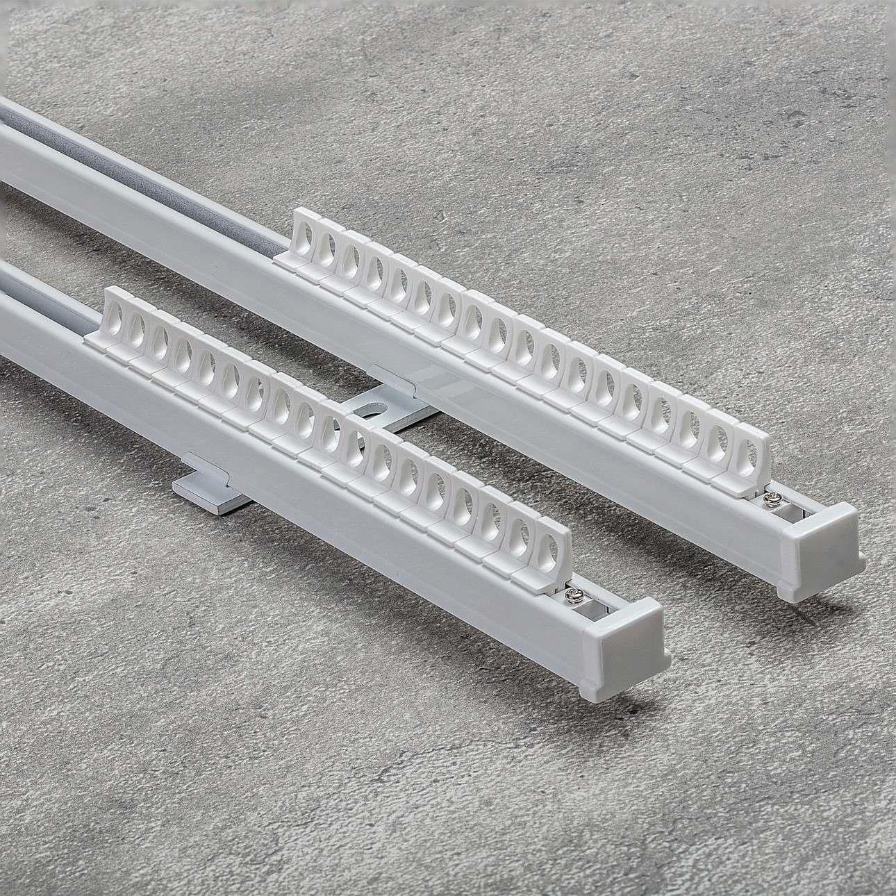 Kompletna szyna aluminiowa sufitowa podwójna prosta o długości 210cm.Wykonana z aluminium. Stanowi alternatywę dla tradycyjnych karniszy, szczególnie polecana tam, gdzie odległość od okna do sufitu nie pozwala zamontować karnisza. Szyny można ze sobą łączyć przy pomocy dodatkowych elementów dostępnych w sprzedaży: łącznik do szyny aluminiowej, łuk do szyny, uchwyt sufitowy oraz inne drobniejsze elementy. Komplet zawiera: szyna prosta o długości 210cm - 2 szt. uchwyt sufitowy klips biały podwójny - 4 szt. suwak z oczkiem - 52 szt. zaślepka biała - 4 szt. Wymiar: gł. 9,5cm, wys. 2cm. Ważne! Montując komplet szyn aluminiowych przysufitowych pamiętaj o haczykach, które umożliwią zawieszenie zasłon i firan.