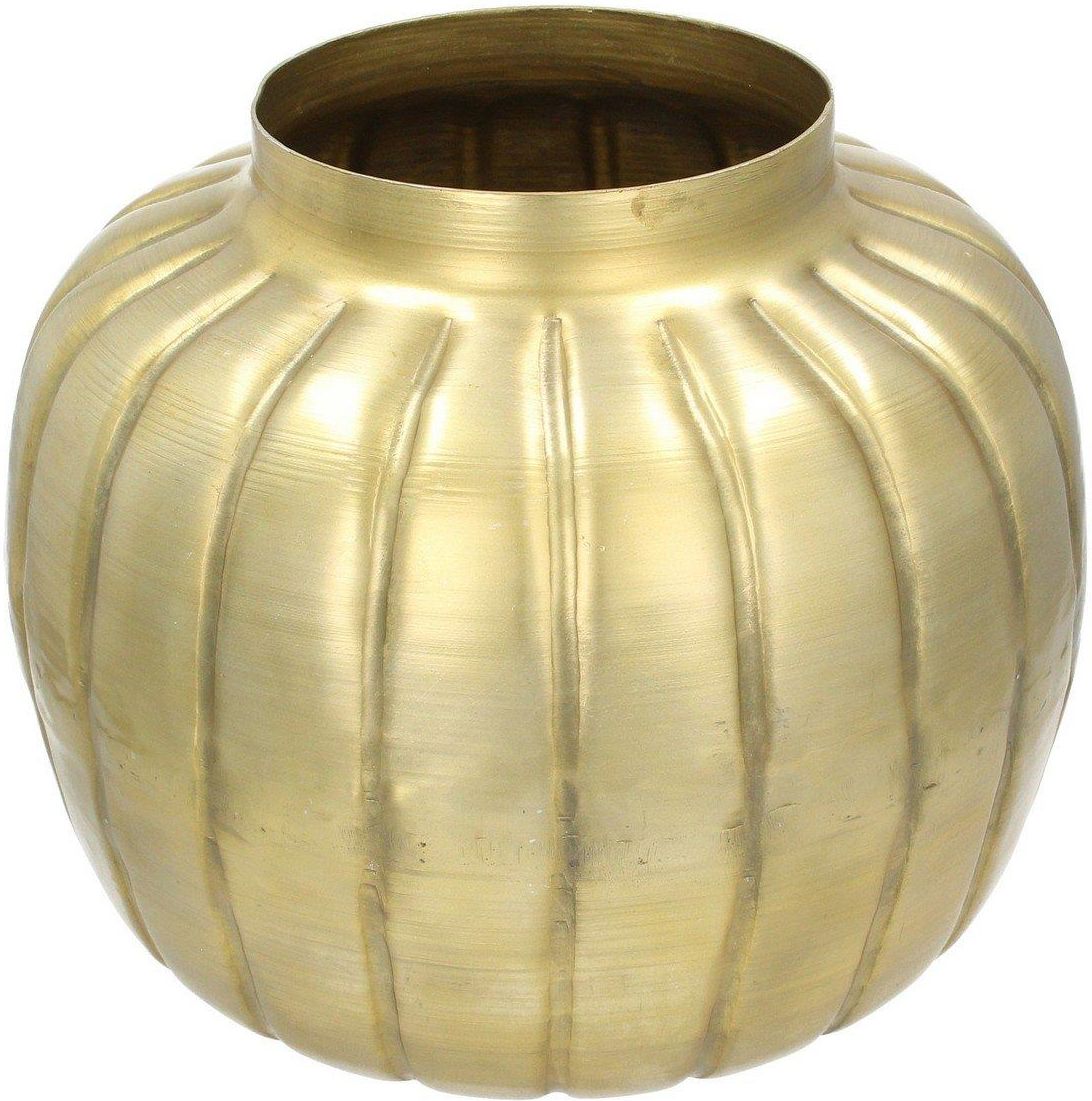 Wazon Arieen 35x35cm, 35 x 35 x 33 cm Wazon w kształcie dyni wykonany z aluminium w kolorze antycznego złota. Designerski wazon w kształcie dyni to elegancki element dekoracyjny wyróżnia się swoją niezwykłą formą. Wykonany z tłoczonego z aluminium w kolorze antycznego złota jest trwały i solidny, zachowując przy tym delikatność i lekkość. Skompletuj go z innymi dekoracjami o podobnej stylistyce. Wymiary: śr. 30 cm, wys. 35 cm. Dane produktu Waga: 1.20kg Rozmiar: 35 x 35 x 33 cm Materiał: aluminium Kolor: mosiądz