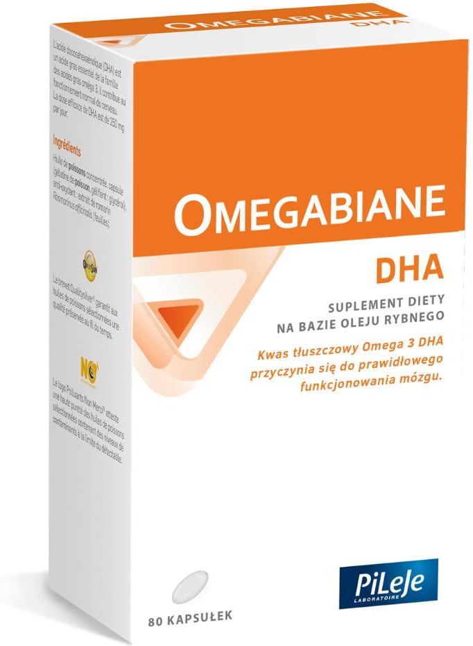 Opis: Omegabiane DHA to preparat, który reguluje poziom cholesterolu i podnosi odporność. Działanie i zastosowanie: Skuteczna dawka DHA i EPA wynosi dla każdego 250 mg na dzień. Zaleca się więc wprowadzenie do codziennego wyżywienia produktów będących źródłem EPA i DHA (olej rzepakowy, olej orzechowy, tłuste ryby). Wykorzystywany tutaj olej pochodzi z sardynek, sardeli europejskiej (anchois) i tuńczyka, gatunków poławianych na Południowym Pacyfiku u wybrzeży Peru. Olej uzyskiwany jest z mięsa tych ryb. Kapsułki Omegabiane DHA zostały stworzone, żeby dostarczyć ilości kwasu omega 3 zalecane przez ANC 2010. Omegabiane DHA to suplement diety który sprzyja właściwemu funkcjonowaniu mózgu i zachowaniu prawidłowego wzroku. Kapsułki zostały stworzone, żeby dostarczyć odpowiedniej ilości kwasu omega 3 DHA. Rekomendowany do suplementacji w: kwasy tłuszczowe wielonienasycone Omega 3 (DHA 250 mg/1 kaspsułka; EPA 69 mg/1 kapsułka) wyciąg z rozmarynu Rosmarinus officinalis (przeciwutleniacz) Suplement diety opracowany na podstawie badań naukowych. Skład: Zawartość kwasów tłuszczowych w 1 kapsułce w 3 kapsułkach Olej rybny - 625 mg - 1875 mg w tym kwasy tłuszczowe wielonienasycone omega 3 - 356 mg - 1068 mg w tym EPA - 69 mg - 207 mg w tym DHA - 250 mg - 750 mg Skoncentrowany olej rybny dostarcza kwasów omega 3 DHA (kwas dokozaheksaenowy) sprzyja właściwemu funkcjonowaniu mózgu i zachowaniu prawidłowego wzroku. Kapsułka (żelatyna rybia, środek żelujący: glicerol) Przeciwutleniacz: wyciąg z rozmarynu Rosmarinus officinalis (liście). Śladowe ilości soi wolnej od GMO Sposób użycia i dawkowanie: Od 1 do 3 kapsułek dziennie. Czas kuracji od 26 do 80 dni. Zawartość opakowania: 1 opakowanie zawiera 80 kapsułek. Przechowywanie: Przechowywać w miejscu niedostępnym dla dzieci, w temperaturze pokojowej, chroniąc od światła i wilgoci.