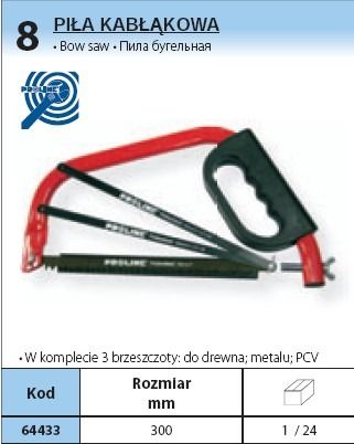 64433 Piła do drewna i metalu kabłąkowa 300mm, 3 b 64433 Piła do drewna i metalu kabłąkowa 300mm, 3 brzeszczoty, Proline Rozmiar: 300 mm Rękojeść z osłoną dłoni W komplecie 3 brzeszczoty: do drewna, metalu, PCV