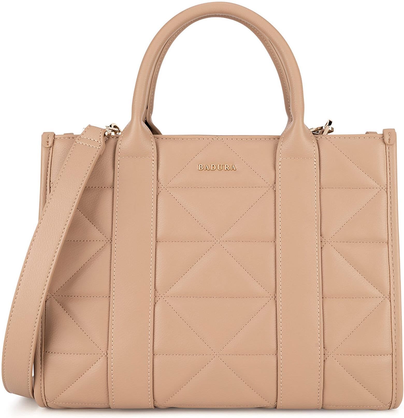 Torebka Badura w eleganckim ciemnobeżowym kolorze to must-have dla każdej stylowej kobiety. Wykonana z wysokogatunkowego tworzywa syntetycznego, łączy w sobie trwałość i modny wygląd. Jej twarda konstrukcja zapewnia bezpieczeństwo przechowywanych przedmiotów, a duży rozmiar mieszczący format A4 sprawia, że torebka jest niezwykle praktyczna – idealna do biura, na uczelnię czy spotkania biznesowe. Regulowany pasek oraz uchwyty na ramię gwarantują komfort noszenia, a dopinana saszetka dodatkowo zwiększa funkcjonalność. Klips magnetyczny umożliwia szybkie i łatwe zamykanie torebki, czyniąc ją wygodnym i eleganckim dodatkiem na co dzień.