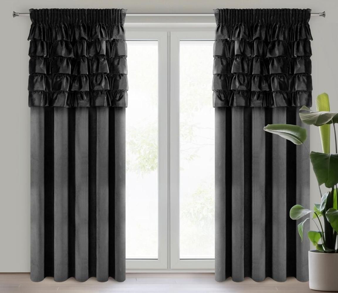 Zasłona 140X270 czarna z welwetu z falbanami taśma Wprowadź luksus i elegancję do swojego wnętrza dzięki naszej welwetowej zasłonie AURA. Ten wyjątkowy element dekoracyjny nie tylko dodaje klasy każdemu pomieszczeniu, ale także zapewnia komfort i prywatność. Miękka i elegancka tkanina welwetowa wyróżnia się luksusowym połyskiem i głębią koloru. Welwet jest znany z doskonałej izolacji termicznej i dźwiękowej. Ekskluzywna tkanina jest niezwykle miękkie i przyjemna w dotyku, co sprawia, że wnętrze staje się bardziej przytulne i komfortowe. Górna część zasłony zdobiona jest pięknymi falbanami, które nadają jej lekkości i romantycznego charakteru. Zasłona ma wszytą w górnej części taśmę marszczącą z funkcją tunelu, dzięki której pięknie się układa po zawieszeniu na karniszu i nienagannie prezentuje, dając możliwość zawieszenia za pomocą żabek, haczyków lub na karniszu z drążkiem. Dodaj swojemu wnętrzu elegancji i blasku dzięki naszej welwetowej zasłonie AURA. Stwórz przestrzeń pełną luksusu i komfortu, która zachwyci każdego. Zamów teraz i odmień swoje wnętrze z niepowtarzalnym stylem i elegancją! Dane techniczne szerokość: 140 cm wysokość: 270 cm skład: 100% poliester - welwet szerokość taśmy: 7 cm wysokość wypustki nad taśmą: 3 cm gramatura: 200 g/m2 Zasłony na taśmie marszczącej, idealne do tradycyjnych karniszy, możemy zawiesić za pomocą agrafek, haczyków lub żabek. Zastosowanie taśmy marszczącej pozwala na równomierne ułożenie tkaniny na karniszu.