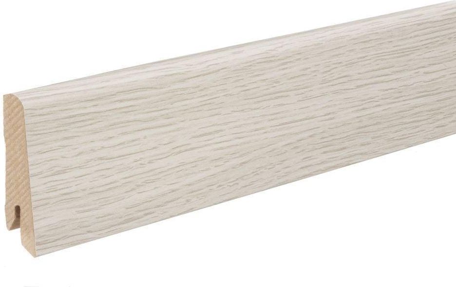 LISTWA MDF EGGER L418 to bielone listwy przypodłogowe o drewnopodobnej strukturze oraz wymiarach 240 cm długości, 1,7 cm szerokości oraz 6 cm wysokości. Okleina listwy przypodłogowej MDF doskonale komponuje się ze wzorem bielonych paneli dostępnych w sklepie Komfort. Prezentowane akcesoria do podłóg skutecznie wypełniają szczeliny dylatacyjne, dzięki czemu zabezpieczają panele przed wybrzuszeniem spowodowanym wnikaniem wilgoci. Listwy przypodłogowe MDF sprawdzą się zarówno w montażu tradycyjnym przy użyciu kleju, jak również za pomocą innowacyjnych klamer pozwalających zakamuflować we wnętrzu listwy nieestetycznie wyglądające przewody i kable.