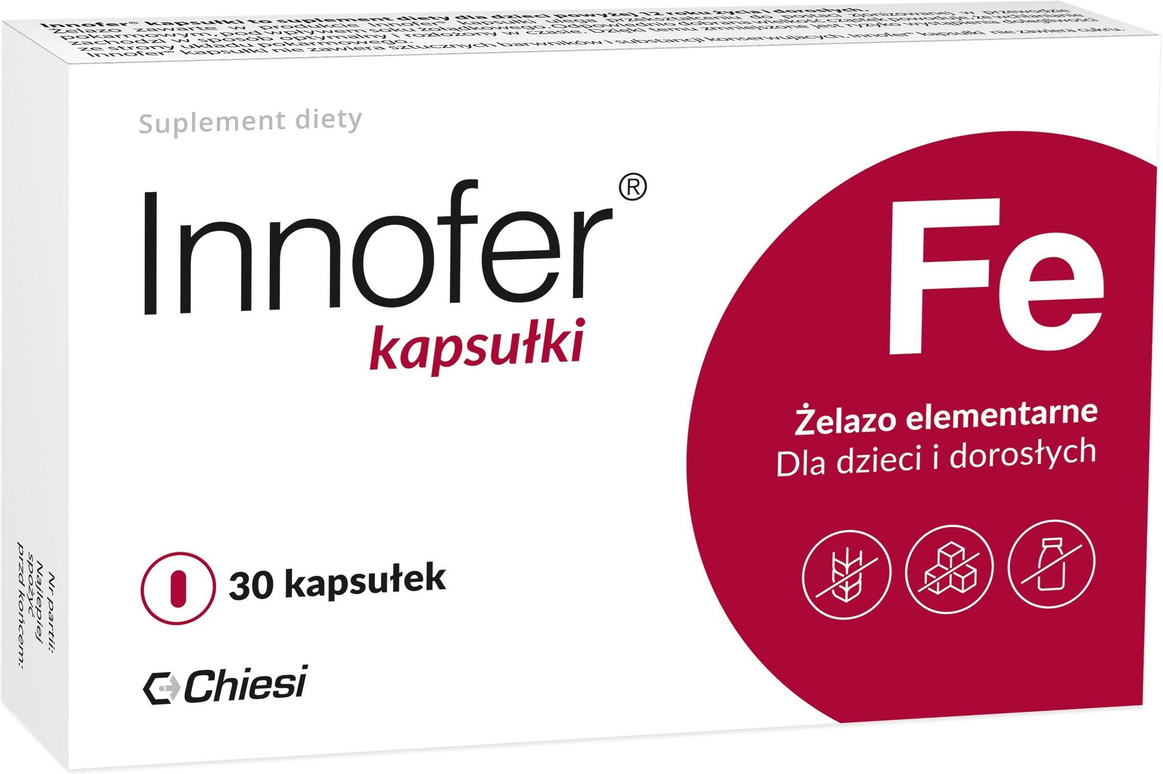 Innofer kapsułki 30 Innofer ® – Twoje wsparcie przy niedoborach żelaza Suplement diety 30 kapsułek Dla kogo? Innofer ® kapsułki 30 to suplement diety o opatentowanym składzie, stworzony z myślą o dzieciach od 12. roku życia i dorosłych, którzy chcą zadbać o prawidłowy poziom żelaza w organizmie. Szczególnie polecany dla: dziewczynek i kobiet intensywnie miesiączkujących, osób uprawiających sport, które potrzebują wsparcia w regeneracji i utrzymaniu odpowiedniego poziomu energii, kobiet po narodzinach dziecka, którym Innofer ® ułatwia zbilansowanie diety, dostarczając organizmowi niezbędnego żelaza,  osób ograniczających mięso w swojej diecie, które potrzebują uzupełnić poziom żelaza przy zmniejszonym spożyciu produktów mięsnych, seniorów Dlaczego warto wybrać Innofer ® ? Opatentowana formuła – Zawiera żelazo elementarne, które dzięki unikalnej technologii stopniowego wchłaniania jest delikatne dla żołądka i minimalizuje ryzyko dolegliwości ze strony układu pokarmowego. Wysoka biodostępność - żelazo elementarne posiada bardzo wysoką biodostępność, wynoszącą 69%.  Prosty skład – Produkt wolny od sztucznych barwników, konserwantów, cukru, glutenu, laktozy i białek mleka krowiego – zalecany również dla osób z nietolerancjami pokarmowymi. Korzyści dla zdrowia Żelazo zawarte w Innofer ® to kluczowy składnik niezbędny do: Prawidłowej produkcji czerwonych krwinek i hemoglobiny, które odpowiadają za transport tlenu w organizmie. Wsparcia układu odpornościowego.  Redukcji uczucia zmęczenia i znużenia, dzięki czemu możesz cieszyć się większą energią na co dzień. Utrzymania prawidłowego metabolizmu energetycznego i funkcji poznawczych, co przekłada się na lepszą koncentrację i sprawność umysłową. Jak stosować? Wystarczy 1 kapsułka dziennie, która dostarcza 20 mg żelaza o wysokiej biodostępności. Kapsułkę należy połknąć w całości, popijając wodą – to proste i wygodne! Dlaczego Innofer ® ? Wysoka zawartość czystego żelaza (98%) w jednej kapsułce. Komfort stosowania – Mniej skutków ubocznych w związku ze stosowaniem żelaza elementarnego w porównaniu do tradycyjnych soli żelaza, takich jak siarczan żelaza. Precyzyjna porcja - 1 kapsułka 20 mg żelaza elementarnego Pobierz ulotkę: kliknij tutaj Innofer ® – idealny wybór dla osób, które chcą wspierać zbilansowaną dietę i wybierają zdrowy styl życia! Zadbaj o swój poziom żelaza w sposób precyzyjny. Jedno opakowanie wystarcza na cały miesiąc stosowania – wybierz Innofer ® i ciesz się zdrowiem na najwyższym poziomie! Sygnatura: CHIESI/AWA/INN/07/10/2024