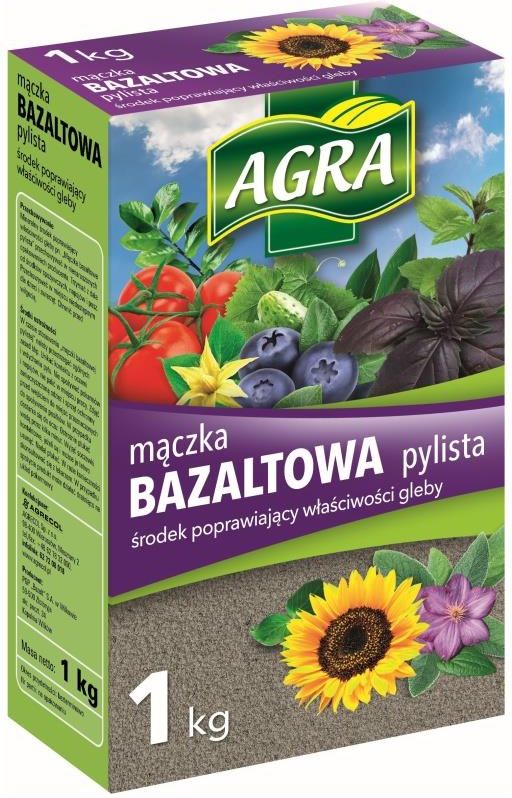 MĄCZKA BAZALTOWA AGRA 1 KG uzupełnia niedobory składników pokarmowych w glebie, poprawia właściwości fizyko-chemiczne gleby, brak ryzyka przenawożenia, naturalny polepszacz gleby, długotrwałe działanie. Mączka bazaltowa to mineralny środek poprawiający właściwości gleby. Jest ona naturalnym produktem wspomagającym wzrost roślin poprzez polepszenie właściwości fizykochemicznych gleby. Środek można stosować w uprawie roślin warzywnych i sadowniczych wszystkich gatunków roślin. Polecany jest szczególnie na gleby lekkie lub zbyt zwięzłe o zbyt niskim odczynie. OPAKOWANIE: 1kg AGRA MĄCZKA BAZALTOWA PYLISTA - 1 KG uzupełnia niedobory składników pokarmowych w glebie, poprawia właściwości fizyko-chemiczne gleby, brak ryzyka przenawożenia, naturalny polepszacz gleby, długotrwałe działanie. Mączka bazaltowa to mineralny środek poprawiający właściwości gleby. Jest ona naturalnym produktem wspomagającym wzrost roślin poprzez polepszenie właściwości fizykochemicznych gleby. Środek można stosować w uprawie roślin warzywnych i sadowniczych wszystkich gatunków roślin. Polecany jest szczególnie na gleby lekkie lub zbyt zwięzłe o zbyt niskim odczynie. OPAKOWANIE: karton 1 kg