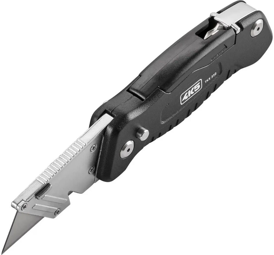 Wielofunkcyjny nóż składany z wymiennym ostrzem trapezowym, zintegrowanym magazynkiem na ostrza, uchwytem na bity i bitami Niezwykle ostre, wymienne ostrze trapezowe wykonane z wysokiej jakości, wytrzymałej stali SK 4 STANDARDOWY NORMALNY ADAPTER: Zintegrowany sześciokątny uchwyt na bity o najpopularniejszym rozmiarze (¼ cala/6,35 mm) oraz bity do śrub krzyżakowych i z rowkiem zwiększają elastyczność Regulowane pozycje ostrza 45° i 90° w celu dostosowania do konkretnych wymagań, zwiększona precyzja i kontrola głębokości cięcia Lekka i bardzo wytrzymała obudowa wykonana ze stopu cynku Zintegrowany magazynek ostrzy dla optymalnego przechowywania ostrzy zapasowych Blokada przycisku utrzymuje ostrze w pozycji otwartej Narzędzie do cięcia pasów Szybka wymiana ostrza - bez dodatkowych narzędzi Idealny do cięcia płyt gipsowo-kartonowych lub wkręcania wkrętów Dzięki niewielkim rozmiarom łatwo mieści się w kieszeni spodni Klips do paska ułatwiający mocowanie 3 ostrza w zestawie