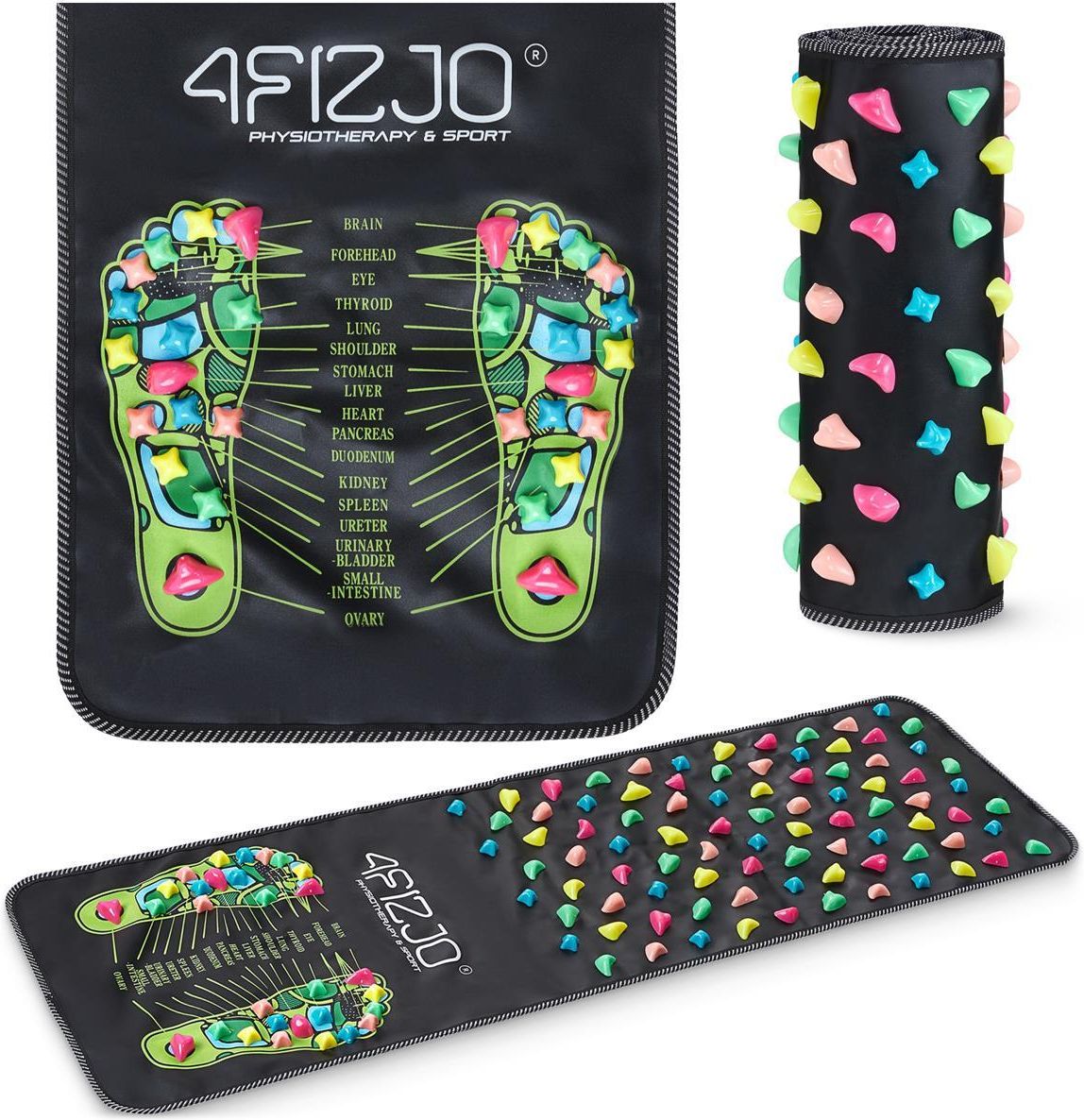MATA DO REFLEKSOLOGII MASAŻU AKUPRESURY STÓP Z KAMYKAMI SENSORYCZNA 120 cm 4FIZJO Sensoryczna mata do stóp 4FIZJO do refleksologii 120 × 35 cm Czy wiesz, że stopy to jedne z najważniejszych części ciała? To właśnie na nich znajduje się wiele ważnych punktów akupresurowych, które wpływają na funkcjonowanie całego organizmu. Z naszą matą do masażu stóp 4FIZJO kompleksowo zadbasz o swoje zdrowie, samopoczucie i relaks. Do tego w łatwy i przyjemny sposób zmniejszysz napięcia i poczujesz upragnioną ulgę w bólu. To jak? Jesteś gotów na spacer z korzyścią dla komfortu twoich stóp i całego ciała? Ile czasu stosować matę do stóp? Wystarczy zaledwie kilkanaście minut z matą do akupresury stóp, aby poczuć przyjemne odprężenie. Tego rodzaju stymulujący masaż standardowo powinien trwać dziennie od 2 do 10 minut. Tym samym czas dla: Początkujących to 2-3 minuty Średniozaawansowanych to 3-10 minut Zaawansowanych to 10-15 minut Przy pierwszym stosowaniu maty do refleksologii możesz odczuwać dyskomfort. Wystarczy wtedy chwilę poczekać, żeby stopy i ciało przyzwyczaiły się do nacisku. Możesz też założyć skarpetki, które zmniejszają odczuwanie bólu. Na co pomaga mata do refleksologii, regeneracji i masażu stóp? Zaletą maty do masażu stóp 4FIZJO jest jej wszechstronne zastosowanie u dzieci i dorosłych. Znakomicie sprosta potrzebom osób prowadzących siedzący tryb życia, czujących nadmierne zmęczenie czy będących w trakcie rehabilitacji. Mata do stóp służy do: Relaksacji stóp i odprężenia ciała Poprawy metabolizmu i krążenia krwi Niwelowania napięć mięśniowych i skurczy Łagodzenia nerwobóli i migren Wzmocnienia odporności organizmu Redukcji stresu i zmęczenia psychicznego Poprawy samopoczucia Ćwiczeń korekcyjnych na koślawość pięt czy płaskostopie Najlepsze wykonanie wspiera regenerację organizmu i mięśni nóg Mata do ćwiczeń stóp 4FIZJO to wysoka jakość i wykonanie. Na macie znajdują się dwie strefy z wypustkami, które pozwalają na stymulację stóp i najlepsze doznania akupunkturowe. Ścieżka zdrowia imituje spacer na boso po kamykach i patykach. Z kolei schemat stóp z oznaczonymi akupunktami pozwala sprawdzić miejsca na stopie oddziaływające na konkretne narządy. Zaletą maty masującej do refleksologii stóp jest to, że jest lekka i poręczna. Dzięki temu można ją zwinąć i przenieść w dowolne miejsce. Jest też łatwa w czyszczeniu. Wystarczy przetrzeć ją wilgotną ściereczką. Jak korzystać z maty do ćwiczeń stóp? Mata sensoryczna z kamykami umożliwia przeprowadzenie terapii, która wspiera regenerację całego organizmu oraz wzmacnia jego odporność i poprawia metabolizm. Aby zacząć masaż i ćwiczenia wystarczy jedynie znaleźć trochę miejsca na podłodze. Następnie możesz wybrać dowolny sposób stymulacji stóp. W pierwszym wariancie stań na początku maty, tam, gdzie jest widoczny zarys stóp. To wystarczy, aby pobudzić akupunkty na stopie. Jeśli pragniesz zwiększyć doznania sensoryczne, wybierz drugi wariant, czyli spacer po całej macie. Możesz do niego też dodać ćwiczenia np.: skłony czy stanie na jednej nodze. Ile czasu stosować matę do stóp? Wystarczy zaledwie kilkanaście minut z matą do akupresury stóp, aby poczuć przyjemne odprężenie. Tego rodzaju stymulujący masaż standardowo powinien trwać dziennie od 20 do 40 minut i nie przekraczać 1 godziny. Tym samym czas dla: Początkujących to 5-10 minut Średniozaawansowanych to 10-20 minut Zaawansowanych to 20-40 minut Przy pierwszym stosowaniu maty do refleksologii możesz odczuwać dyskomfort. Wystarczy wtedy chwilę poczekać, żeby stopy i ciało przyzwyczaiły się do nacisku. Możesz też założyć skarpetki, które zmniejszają odczuwanie bólu. Przeciwwskazania Stosując matę masującą do akupresury stóp z kamykami, należy zachować ostrożność. Nie należy korzystać z maty, jeśli: występują ostre stany zapalne stawów lub tkanek miękkich, jest wrażliwa lub uszkodzona skóra (skaleczenia, rany otwarte, owrzodzenia i inne); są przyjmowane leki przeciwzakrzepowe, występuje zaburzenie krzepliwości krwi (w tym hemofilia), jest infekcja skóry np. grzybica, dana osoba choruje na nowotwór.