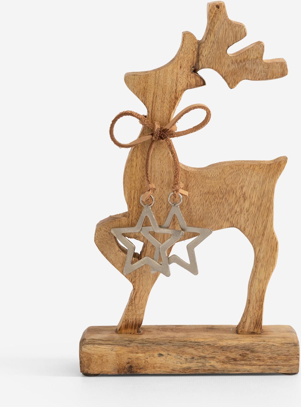 Wprowadź do swojego wnętrza naturalny, świąteczny urok dzięki temu eleganckiemu reniferowi. Wykonany z naturalnego drewna, z pięknym usłojeniem, idealnie wpisuje się w ekologiczne i minimalistyczne trendy. Delikatne detale, takie jak zarysowane rogi i stylowy sznurek z zawieszkami w kształcie gwiazd, dodają mu wyjątkowego, rustykalnego charakteru.
