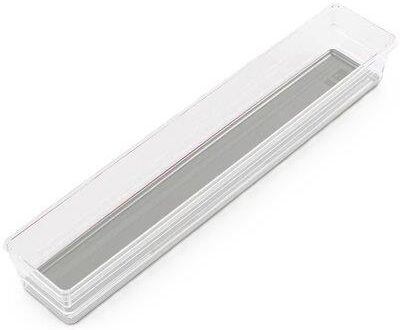 Praktyczny prostokątny, smukły kształt pasuje do większości szuflad, umożliwiając schludne uporządkowanie różnych przedmiotów w szufladach i na półkach. Dzięki zastosowaniu gumowej podkładki na dnie pojemnik nie przesuwa się w szufladzie, a co za tym idzie, zabezpiecza przed porysowaniem. Przejrzystość ścianek bocznych to kolejna wyjątkowa cecha, która pozwala na szybką identyfikację zawartości. Możliwość sztaplowania zapewnia optymalne wykorzystanie przestrzeni, co jest nieocenione w małych szufladkach.